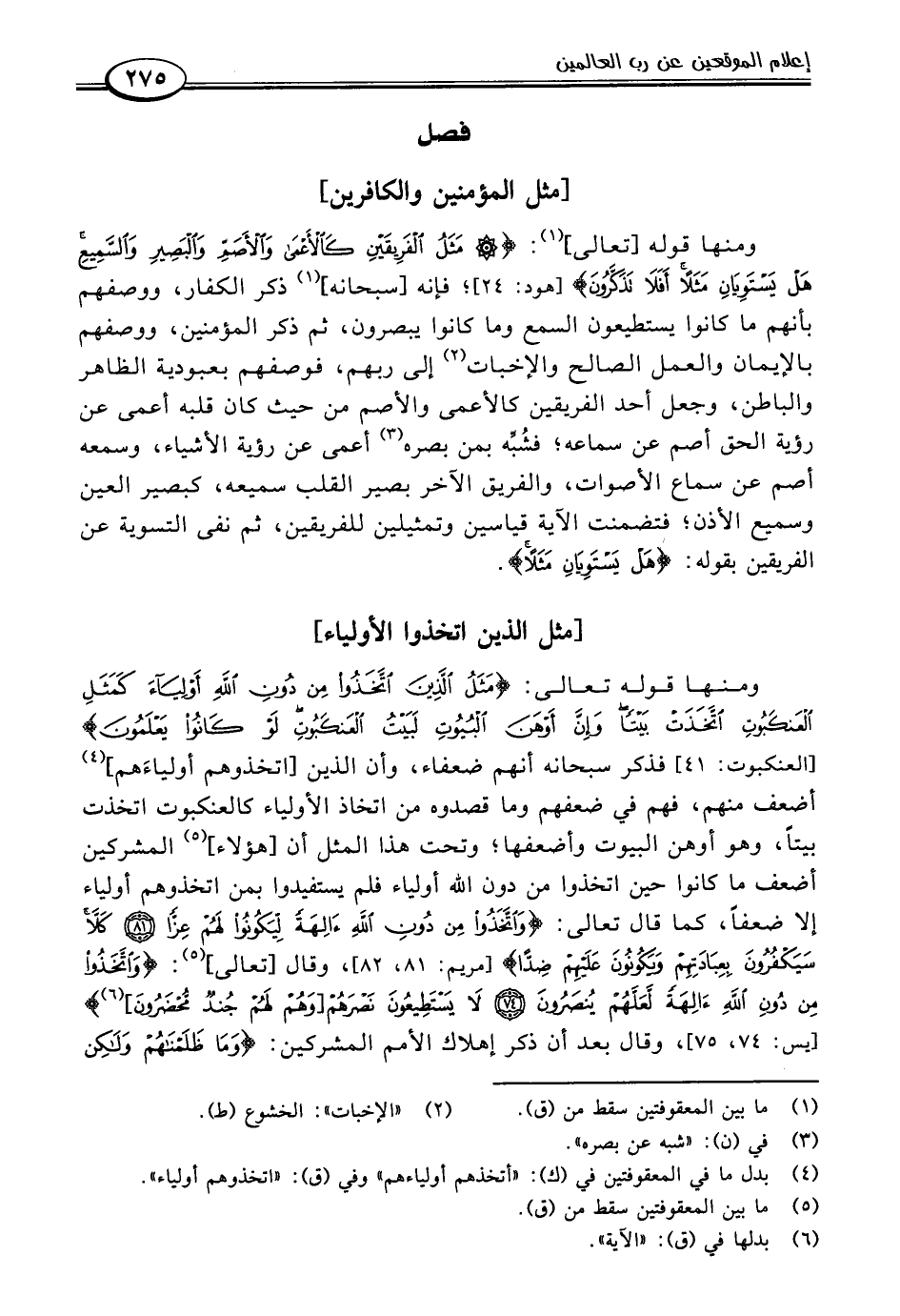ومنها قوله [تعالى] (١): {مَثَلُ الْفَرِيقَيْنِ كَالْأَعْمَى وَالْأَصَمِّ وَالْبَصِيرِ وَالسَّمِيعِ هَلْ يَسْتَوِيَانِ مَثَلًا أَفَلَا تَذَكَّرُونَ (٢٤)} [هود: ٢٤]؛ فإنه [سبحانه] (١) ذكر الكفار، ووصفهم بأنهم ما كانوا يستطيعون السمع وما كانوا يبصرون، ثم ذكر المؤمنين، ووصفهم بالإيمان والعمل الصالح والإخبات (٢) إلى ربهم، فوصفهم بعبودية الظاهر والباطن، وجعل أحد الفريقين كالأعمى والأصم من حيث كان قلبه أعمى عن رؤية الحق أصم عن سماعه؛ فشُبِّه بمن بصره (٣) أعمى عن رؤية الأشياء، وسمعه أصم عن سماع الأصوات، والفريق الآخر بصير القلب سميعه، كبصير العين وسميع الأذن؛ فتضمنت الآية قياسين وتمثيلين للفريقين، ثم نفى التسوية عن الفريقين بقوله: {هَلْ يَسْتَوِيَانِ مَثَلًا}.