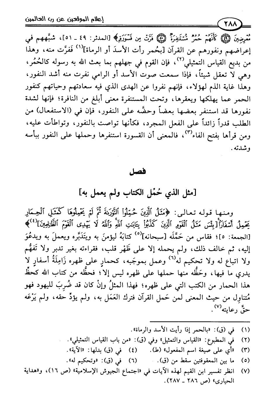 ومنها قوله تعالى: {مَثَلُ الَّذِينَ حُمِّلُوا التَّوْرَاةَ ثُمَّ لَمْ يَحْمِلُوهَا كَمَثَلِ الْحِمَارِ يَحْمِلُ أَسْفَارًا [بِئْسَ مَثَلُ الْقَوْمِ الَّذِينَ كَذَّبُوا بِآيَاتِ اللَّهِ وَاللَّهُ لَا يَهْدِي الْقَوْمَ الظَّالِمِينَ] (٤)} [الجمعة: ٥]؛ فقاس من حَمَّلَه [سبحانه] (٥) كتابَهُ ليؤمنَ به ويتَدَبَّره ويعملَ به ويدعُوَ إليه، ثم خالف ذلك، ولم يحمله إلا على ظَهْر قلب، فقراءته بغير تدبر ولا تَفهُّم ولا اتباع له ولا تحكيم له (٦) وعمل بموجَبه، كحمارٍ على ظهره زَامِلَةُ أسفارٍ لا يدري ما فيها، وحَظُّه منها حملها على ظهره ليس إلا؛ فحظُّه من كتاب اللَّه كحظِّ هذا الحمار من الكتب التي على ظهره؛ فهذا المثلُ وإنْ كان قد ضُرِبَ لليهود فهو مُتناوِل من حيث المعنى لمن حَمل القرآن فترك العَمَل به، ولم يؤدِّ حقه، ولم يَرْعَه حقَّ رعايته (٧).
