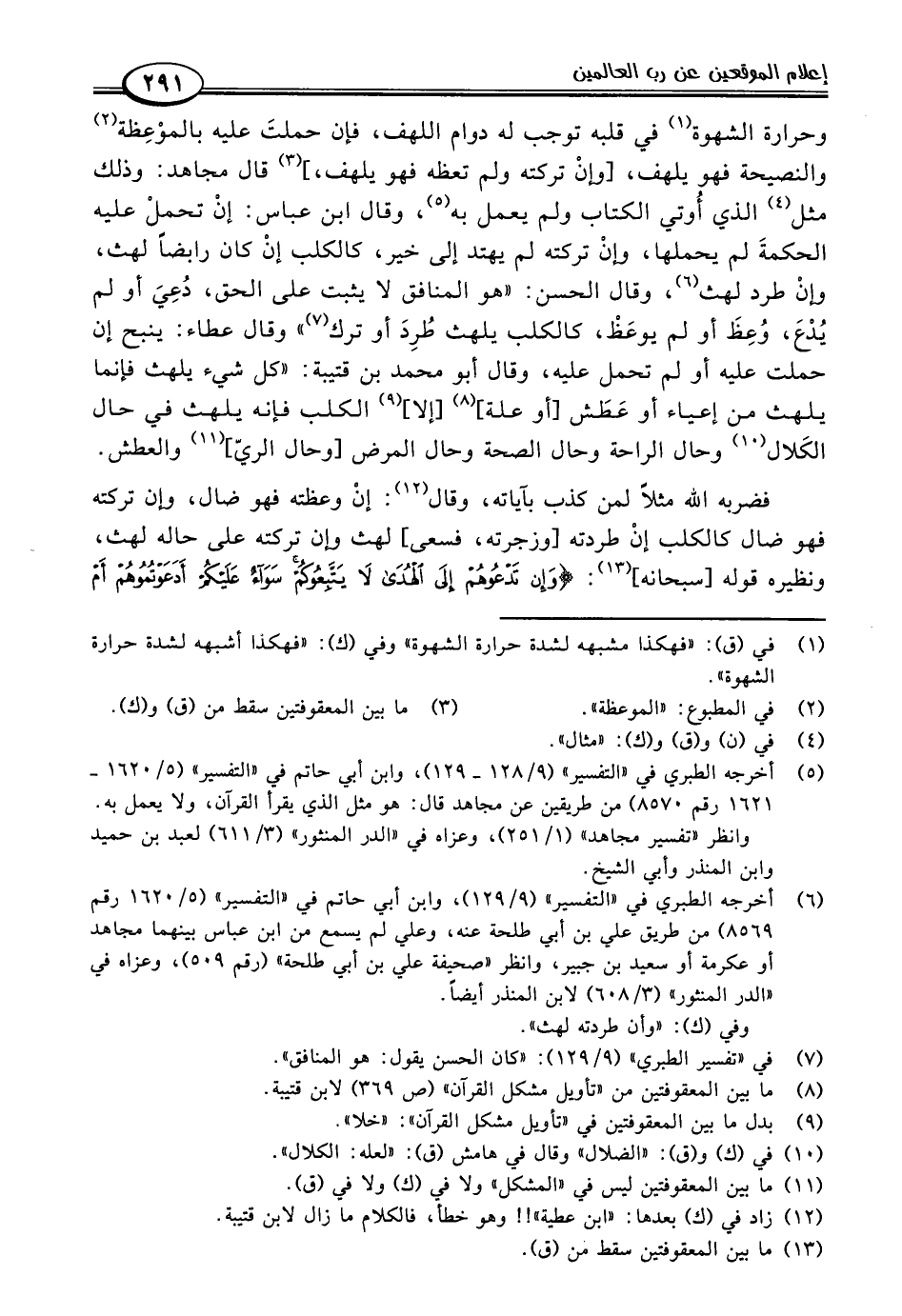 وحرارة الشهوة (١) في قلبه توجب له دوام اللهف، فإن حملتَ عليه بالموْعِظة (٢) والنصيحة فهو يلهف، [وإنْ تركته ولم تعظه فهو يلهف]، (٣) قال مجاهد: وذلك مثل (٤) الذي أُوتي الكتاب ولم يعمل به (٥)، وقال ابن عباس: إنْ تحملْ عليه الحكمةَ لم يحملها، وإنْ تركته لم يهتد إلى خير، كالكلب إنْ كان رابضًا لهث، وإنْ طرد لهث (٦)، وقال الحسن: "هو المنافق لا يثبت على الحق، دُعِيَ أو لم يُدْعَ، وُعِظَ أو لم يوعَظْ، كالكلب يلهث طُرِدَ أو ترك (٧) " وقال عطاء: ينبح إن حملت عليه أو لم تحمل عليه، وقال أبو محمد بن قتيبة: "كل شيء يلهث فإنما يلهث من إعياء أو عَطَش [أو علة] (٨) [إلا] (٩) الكلب فإنه يلهث في حال الكَلال (١٠) وحال الراحة وحال الصحة وحال المرض [وحال الريّ] (١١) والعطش.