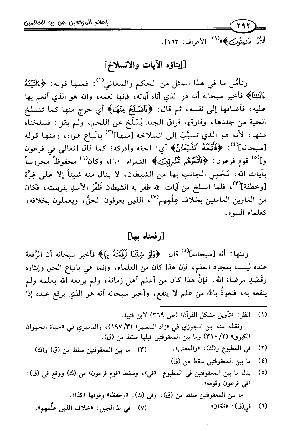 ومنها: أنه [سبحانه] (٤) قال: {وَلَوْ شِئْنَا لَرَفَعْنَاهُ بِهَا} فأخبر سبحانه أن الرِّفعة عنده ليست بمجرد العلم، فإن هذا كان من العلماء، وإنما هي باتباع الحق وإيثاره وقَصْدِ مرضاة اللَّه، فإنَّ هذا كان من أعلم أهل زمانه، ولم يرفعه اللَّه بعلمه ولم ينفعه به، فنعوذُ باللَّه من علم لا ينفع، وأخبر سبحانه أنه هو الذي يرفع عبده إذا