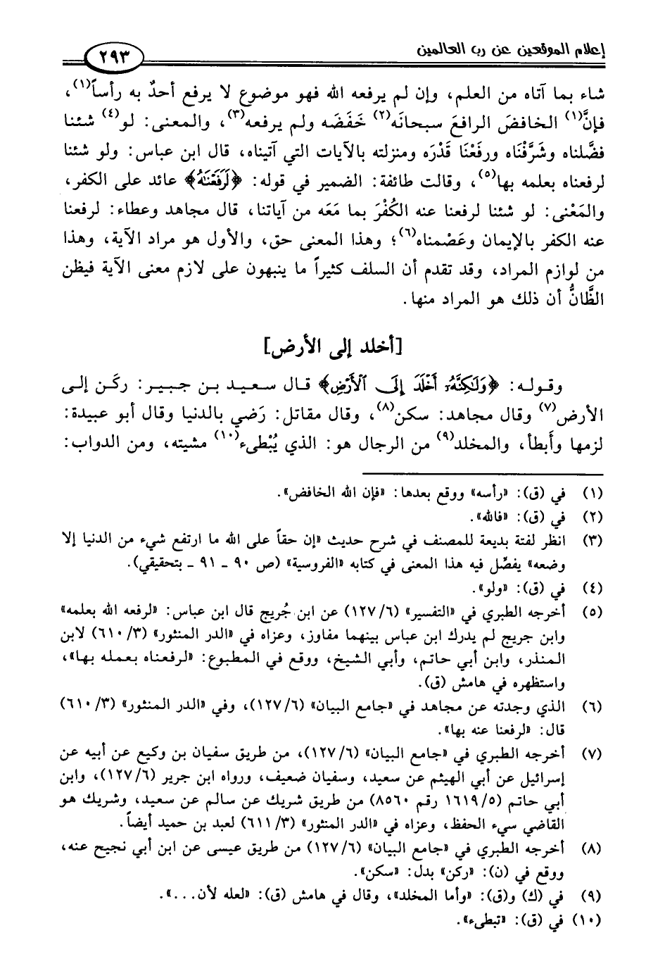 شاء بما آتاه من العلم، وإن لم يرفعه اللَّه فهو موضوع لا يرفع أحدٌ به رأسًا (١)، فإنَّ (١) الخافضَ الرافعَ سبحانَه (٢) خَفَضَه ولم يرفعه (٣)، والمعنى: لو (٤) شئنا فصَّلناه وشَرَّفْنَاه ورفَعْنَا قَدْرَه ومنزلته بالآيات التي آتيناه، قال ابن عباس: ولو شئنا لرفعناه بعلمه بها (٥)، وقالت طائفة: الضمير في قوله: {لَرَفَعْنَاهُ} عائد على الكفر، والمَعْنى: لو شئنا لرفعنا عنه الكُفْرَ بما مَعَه من آياتنا، قال مجاهد وعطاء: لرفعنا عنه الكفر بالإيمان وعَصْمناه (٦)؛ وهذا المعنى حق، والأول هو مراد الآية، وهذا من لوازم المراد، وقد تقدم أن السلف كثيرًا ما ينبهون على لازم معنى الآية فيظن الظَّانُّ أن ذلك هو المراد منها.