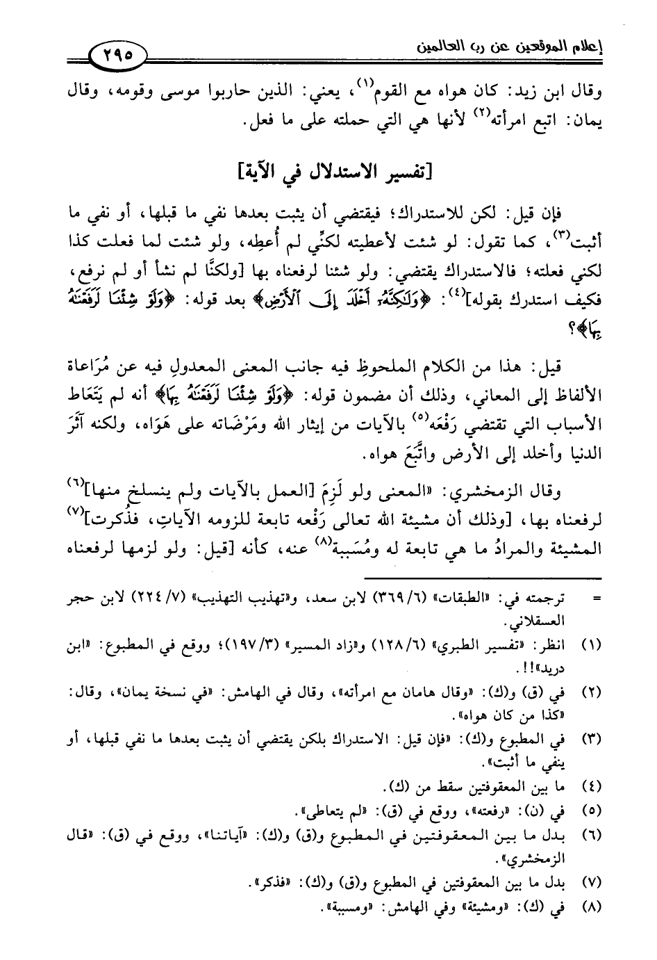 وقال الزمخشري: "المعنى ولو لَزِمَ [العمل بالآيات ولم ينسلخ منها] (٦) لرفعناه بها، [وذلك أن مشيئة اللَّه تعالى رَفْعه تابعة للزومه الآياتِ، فذُكرت] (٧) المشيئة والمرادُ ما هي تابعة له ومُسَببة (٨) عنه، كأنه [قيل: ولو لزمها لرفعناه