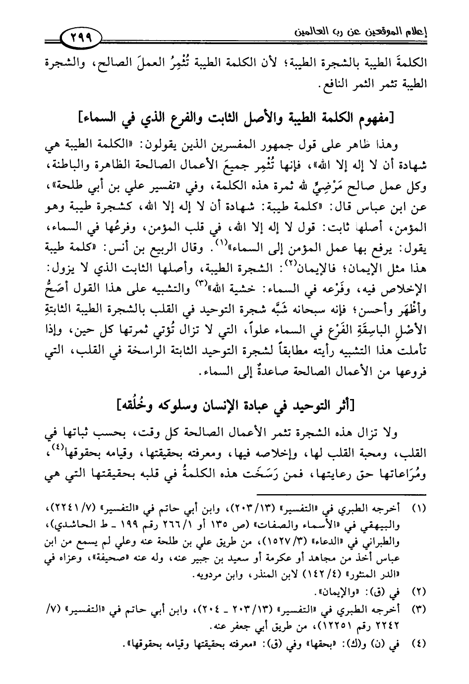وهذا طاهر على قول جمهور المفسرين الذين يقولون: "الكلمة الطيبة هي شهادة أن لا إله إلا اللَّه"، فإنها تُثْمِر جميعَ الأعمال الصالحة الظاهرة والباطنة، وكل عمل صالح مَرْضِيٍّ للَّه ثمرة هذه الكلمة، وفي "تفسير علي بن أبي طلحة"، عن ابن عباس قال: "كلمة طيبة: شهادة أن لا إله إلا اللَّه، كشجرة طيبة وهو المؤمن، أصلها ثابت: قول لا إله إلا اللَّه، في قلب المؤمن، وفرعُها في السماء، يقول: يرفع بها عمل المؤمن إلى السماء" (١). وقال الربيع بن أنس: "كلمة طيبة هذا مثل الإيمان؛ فالإيمان (٢): الشجرة الطيبة، وأصلها الثابت الذي لا يزول: الإخلاص فيه، وفَرْعه في السماء: خشية اللَّه" (٣) والتشبيه على هذا القول أصَحُّ وأظْهَر وأحسن؛ فإنه سبحانه شَبَّه شجرة التوحيد في القلب بالشجرة الطيبة الثابتةِ الأصْلِ الباسِقَةِ الفَرْع في السماء علوًا، التي لا تزال تُؤتي ثمرتها كل حين، وإذا تأملت هذا التشبيه رأيته مطابقًا لشجرة التوحيد الثابتة الراسخة في القلب، التي فروعها من الأعمال الصالحة صاعدةٌ إلى السماء.
