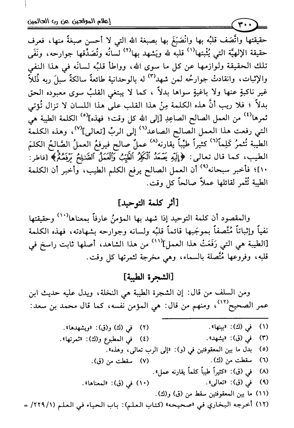 حقيقتها واتَّصَف قلبُه بها وانْصَبَغَ بها بصبغة اللَّه التي لا أحسن صبغةً منها، فعرف حقيقة الإلهيَّة التي يُثْبتها (١) قلبه للَّه ويَشهد بها (٢) لسانُه وتُصَدِّقها جوارحه، ونَفَى تلك الحقيقة ولوازمها عن كل ما سوى اللَّه، وواطأ قلبُه لسانَه في هذا النفي والإثبات، وانقادتْ جوارحُه لمن شهد (٣) له بالوحدانية طائعةً سالكةً سبلَ ربه ذُللًا غير ناكبةٍ عنها ولا باغيةٍ سواها بدلًا، كما لا يبتغي القلبُ سوى معبوده الحق بدلًا؛ فلا ريب أنَّ هذه الكلمة مِنْ هذا القلب على هذا اللسان لا تزال تُؤتي ثمرها (٤) من العمل الصالح الصاعِدِ [إلى اللَّه كل وقت؛ فهذه] (٥) الكلمة الطيبة هي التي رفعت هذا العمل الصالح الصاعد (٦) إلى الربِّ [تعالى] (٧)، وهذه الكلمة الطيبة تُثمرُ كَلِمًا (٦) كثيرًا طيِّبًا يقارنه (٨) عملٌ صالح فيرفعُ العملُ الصَّالحُ الكلمَ الطيب، كما قال تعالى: {إِلَيْهِ يَصْعَدُ الْكَلِمُ الطَّيِّبُ وَالْعَمَلُ الصَّالِحُ يَرْفَعُهُ} [فاطر: ١٠]؛ فأخبر سبحانه (٩) أن العمل الصالح يرفع الكلم الطيب، وأخبر أن الكلمة الطيبة تُثْمر لقائلها عملًا صالحًا كل وقت.