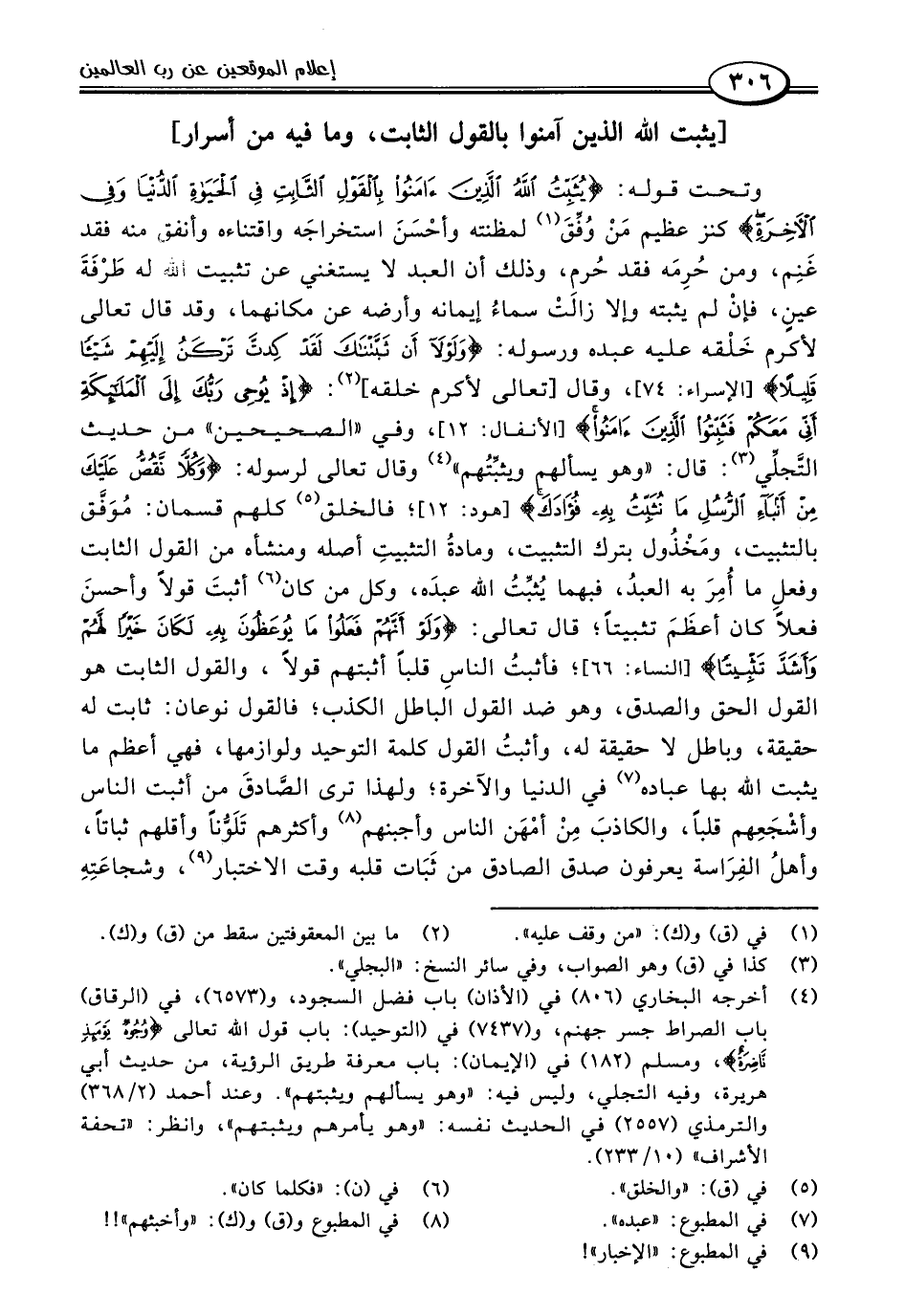 وتحت قوله: {يُثَبِّتُ اللَّهُ الَّذِينَ آمَنُوا بِالْقَوْلِ الثَّابِتِ فِي الْحَيَاةِ الدُّنْيَا وَفِي الْآخِرَةِ} كنز عظيم مَنْ وُفقَ (١) لمظنته وأحْسَنَ استخراجَه واقتناءه وأنفق منه فقد غَنِم، ومن حُرِمَه فقد حُرم، وذلك أن العبد لا يستغني عن تثبيت اللَّه له طَرْفَةَ عينٍ، فإنْ لم يثبته وإلا زالَتْ سماءُ إيمانه وأرضه عن مكانهما، وقد قال تعالى لأكرم خَلْقه عليه عبده ورسوله: {وَلَوْلَا أَنْ ثَبَّتْنَاكَ لَقَدْ كِدْتَ تَرْكَنُ إِلَيْهِمْ شَيْئًا قَلِيلًا} [الإسراء: ٧٤]، وقال [تعالى لأكرم خلقه] (٢): {إِذْ يُوحِي رَبُّكَ إِلَى الْمَلَائِكَةِ أَنِّي مَعَكُمْ فَثَبِّتُوا الَّذِينَ آمَنُوا} [الأنفال: ١٢]، وفي "الصحيحين" من حديث التَّجلِّي (٣): قال: "وهو يسألهم ويثبِّتُهم" (٤) وقال تعالى لرسوله: {وَكُلًّا نَقُصُّ عَلَيْكَ مِنْ أَنْبَاءِ الرُّسُلِ مَا نُثَبِّتُ بِهِ فُؤَادَكَ} [هود: ١٢٠]؛ فالخلق (٥) كلهم قسمان: مُوَفَّق بالتثبيت، ومَخْذُول بترك التثبيت، ومادةُ التثبيتِ أصله ومنشأه من القول الثابت وفعلِ ما أُمِرَ به العبدُ، فبهما يُثبِّتُ اللَّه عبدَه، وكل من كان (٦) أثبتَ قولًا وأحسنَ فعلًا كان أعظَمَ تثبيتًا؛ قال تعالى: {وَلَوْ أَنَّهُمْ فَعَلُوا مَا يُوعَظُونَ بِهِ لَكَانَ خَيْرًا لَهُمْ وَأَشَدَّ تَثْبِيتًا (٦٦)} [النساء: ٦٦]؛ فأثبتُ الناسِ قلبًا أثبتهم قولًا، والقول الثابت هو القول الحق والصدق، وهو ضد القول الباطل الكذب؛ فالقول نوعان: ثابت له حقيقة، وباطل لا حقيقة له، وأثبتُ القول كلمة التوحيد ولوازمها، فهي أعظم ما يثبت اللَّه بها عباده (٧) في الدنيا والآخرة؛ ولهذا ترى الصَّادقَ من أثبت الناس وأشْجَعِهم قلبًا، والكاذبَ مِنْ أمْهَن الناس وأجبنهم (٨) وأكثرهم تَلَوُّنًا وأقلهم ثباتًا، وأهلُ الفِرَاسة يعرفون صدق الصادق من ثَبَات قلبه وقت الاختبار (٩)، وشجاعَتِهِ