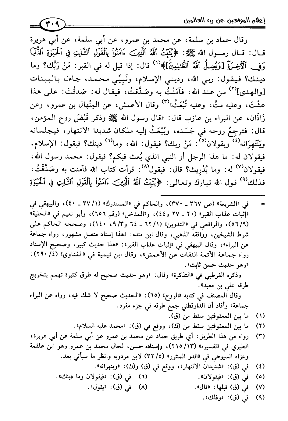 وقال حماد بن سلمة، عن محمد بن عمرو، عن أبي سلمة، عن أبي هريرة قال: قال رسول اللَّه -صلى اللَّه عليه وسلم-: {يُثَبِّتُ اللَّهُ الَّذِينَ آمَنُوا بِالْقَوْلِ الثَّابِتِ فِي الْحَيَاةِ الدُّنْيَا وَفِي الْآخِرَةِ [وَيُضِلُّ اللَّهُ الظَّالِمِينَ]} (١) قال: إذا قيل له في القبر: مَنْ رَبُّك؟ وما دينك؟ فيقول: ربي اللَّه، وديني الإسلام، ونَبِيِّي محمد، جاءنا بالبينات [والهدى] (٢) من عند اللَّه، فآمنْتُ به وصَدَّقتُ، فيقال له: صَدقْتَ: على هذا عشْتَ، وعليه متَّ، وعليه تُبْعَثُ" (٣) وقال الأعمش، عن المِنْهال بن عمرو، وعن زَاذَان، عن البراء بن عازب قال: "قال رسول اللَّه -صلى اللَّه عليه وسلم- وذكر قَبْضَ روح المؤمن، قال: فترجِعُ روحه في جَسَده، ويُبْعَثُ إليه ملكان شديدا الانتهار، فيجلسانه وَينْتَهِرَانه (٤) ويقولان (٥): مَنْ ربك؟ فيقول: اللَّه، وما (٦) دينك؟ فيقول: الإسلام، فيقولان له: ما هذا الرجل أو النبي الذي بُعث فيكم؟ فيقول: محمد رسول اللَّه، فيقولان (٧) له: وما يُدْرِيك؟ قال: فيقول (٨): قرأت كتاب اللَّه فآمنت به وصَدَّقْتُ، فذلك (٩) قول اللَّه تبارك وتعالى: {يُثَبِّتُ اللَّهُ الَّذِينَ آمَنُوا بِالْقَوْلِ الثَّابِتِ فِي الْحَيَاةِ