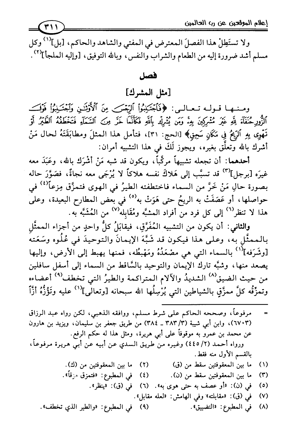 والثاني: أن يكون من التشبيه المُفَرَّقِ، فيقابَلُ كلُّ واحدٍ من أجزاء الممثَّلِ بالممثَّل به، وعلى هذا فيكون قد شَبَّهَ الإيمانَ والتوحيدَ في عُلُوه وسَعَته [وشَرَفه] (١) بالسماء التي هي مصْعَدُهُ ومَهْبطُه، فمنها يهبط إلى الأرض، وإليها يصعد منها، وشبَّه تارك الإيمان والتوحيد بالسَّاقط من السماء إلى أسفل سافلين من حيث الضيق (٨) الشديدُ والآلام المتراكمة والطيرُ التي تخطف (٩) أعضاءه وتمزِّقُه كل ممزَّقٍ بالشياطين التي يُرْسِلُها اللَّه سبحانه [وتعالى] (١) عليه وتَؤُزُّهُ أزًّا