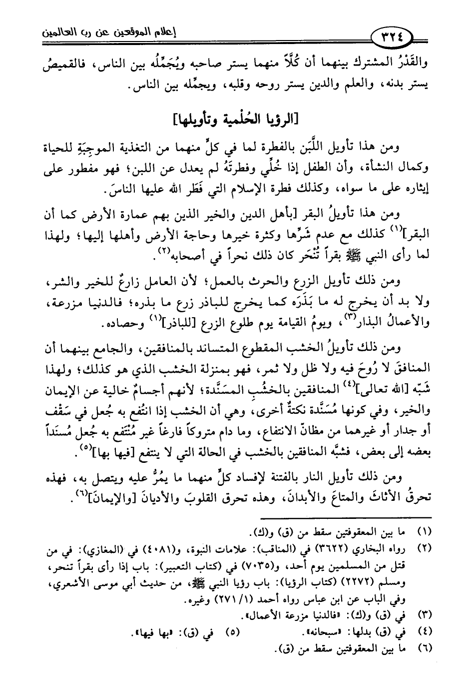 ومن هذا تأويلُ البقر [باهل الدين والخير الذين بهم عمارة الأرض كما أن البقر] (١) كذلك مع عدم شَرِّها وكثرة خيرها وحاجة الأرض وأهلها إليها؛ ولهذا لما رأى النبي -صلى اللَّه عليه وسلم- بقرًا تُنْحَر كان ذلك نحرًا في أصحابه (٢).