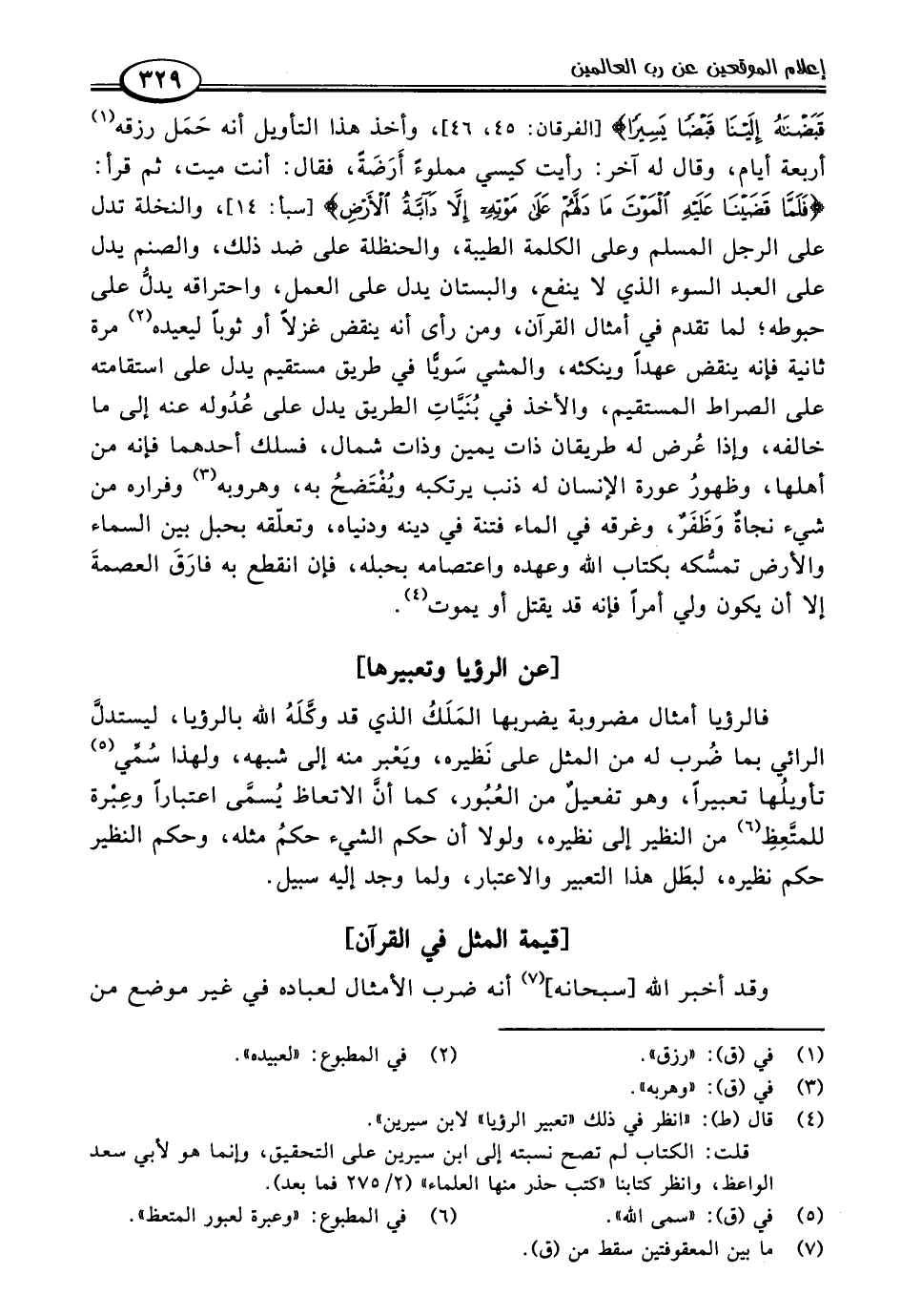 ثُمَّ قَبَضْنَاهُ إِلَيْنَا قَبْضًا يَسِيرًا (٤٦)} [الفرقان: ٤٥، ٤٦]، وأخذ هذا التأويل أنه حَمَل رزقه (١) أربعة أيام، وقال له آخر: رأيت كيسي مملوءً أَرَضَةً، فقال: أنت ميت، ثم قرأ: {فَلَمَّا قَضَيْنَا عَلَيْهِ الْمَوْتَ مَا دَلَّهُمْ عَلَى مَوْتِهِ إِلَّا دَابَّةُ الْأَرْضِ} [سبأ: ١٤]، والنخلة تدل على الرجل المسلم وعلى الكلمة الطيبة، والحنظلة على ضد ذلك، والصنم يدل على العبد السوء الذي لا ينفع، والبستان يدل على العمل، واحتراقه يدلُّ على حبوطه؛ لما تقدم في أمثال القرآن، ومن رأى أنه ينقض غزلًا أو ثوبًا ليعيده (٢) مرة ثانية فإنه ينقض عهدًا وينكثه، والمشي سَويًّا في طريق مستقيم يدل على استقامته على الصراط المستقيم، والأخذ في بُنَيَّاتِ الطريق يدل على عُدُوله عنه إلى ما خالفه، وإذا عُرض له طريقان ذات يمين وذات شمال، فسلك أحدهما فإنه من أهلها، وظهورُ عورة الإنسان له ذنب يرتكبه ويُفْتَضحُ به، وهروبه (٣) وفراره من شيء نجاةٌ وَظَفَرٌ، وغرقه في الماء فتنة في دينه ودنياه، وتعلّقه بحبل بين السماء والأرض تمسكه بكتاب اللَّه وعهده واعتصامه بحبله، فإن انقطع به فارَقَ العصمةَ إلا أن يكون ولي أمرًا فإنه قد يقتل أو يموت (٤).