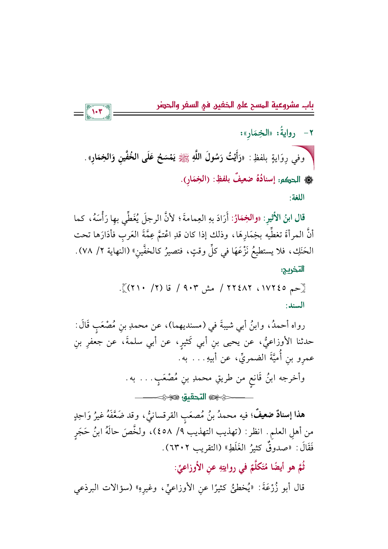 قال ابنُ الأثيرِ: ((والخِمَارُ: أَرَادَ بهِ العِمامةَ؛ لأنَّ الرجلَ يُغَطِّي بهِا رَأْسَهُ، كما أنَّ المرأةَ تغطِّيه بخِمَارِهَا، وذلك إذا كان قد اعْتمَّ عِمَّةَ العربِ فأدَارَها تحت الحَنَكِ، فلا يستطيعُ نَزْعَهَا في كلِّ وقتٍ، فتصيرُ كالخفَّينِ)) (النهاية ٢/ ٧٨).