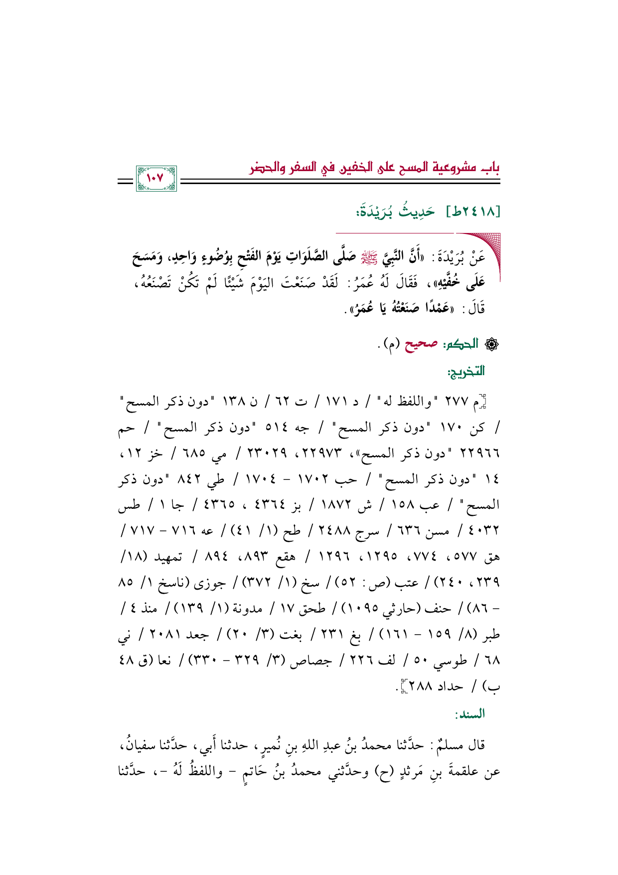◼ عَنْ بُرَيْدَةَ: ((أَنَّ النَّبِيَّ صلى الله عليه وسلم صَلَّى الصَّلَوَاتِ يَوْمَ الفَتْحِ بِوُضُوءٍ وَاحِدٍ، وَمَسَحَ عَلَى خُفَّيْهِ))، فَقَالَ لَهُ عُمَرُ: لَقَدْ صَنَعْتَ اليَوْمَ شَيْئًا لَمْ تَكُنْ تَصْنَعُهُ، قَالَ: ((عَمْدًا صَنَعْتُهُ يَا عُمَرُ)).