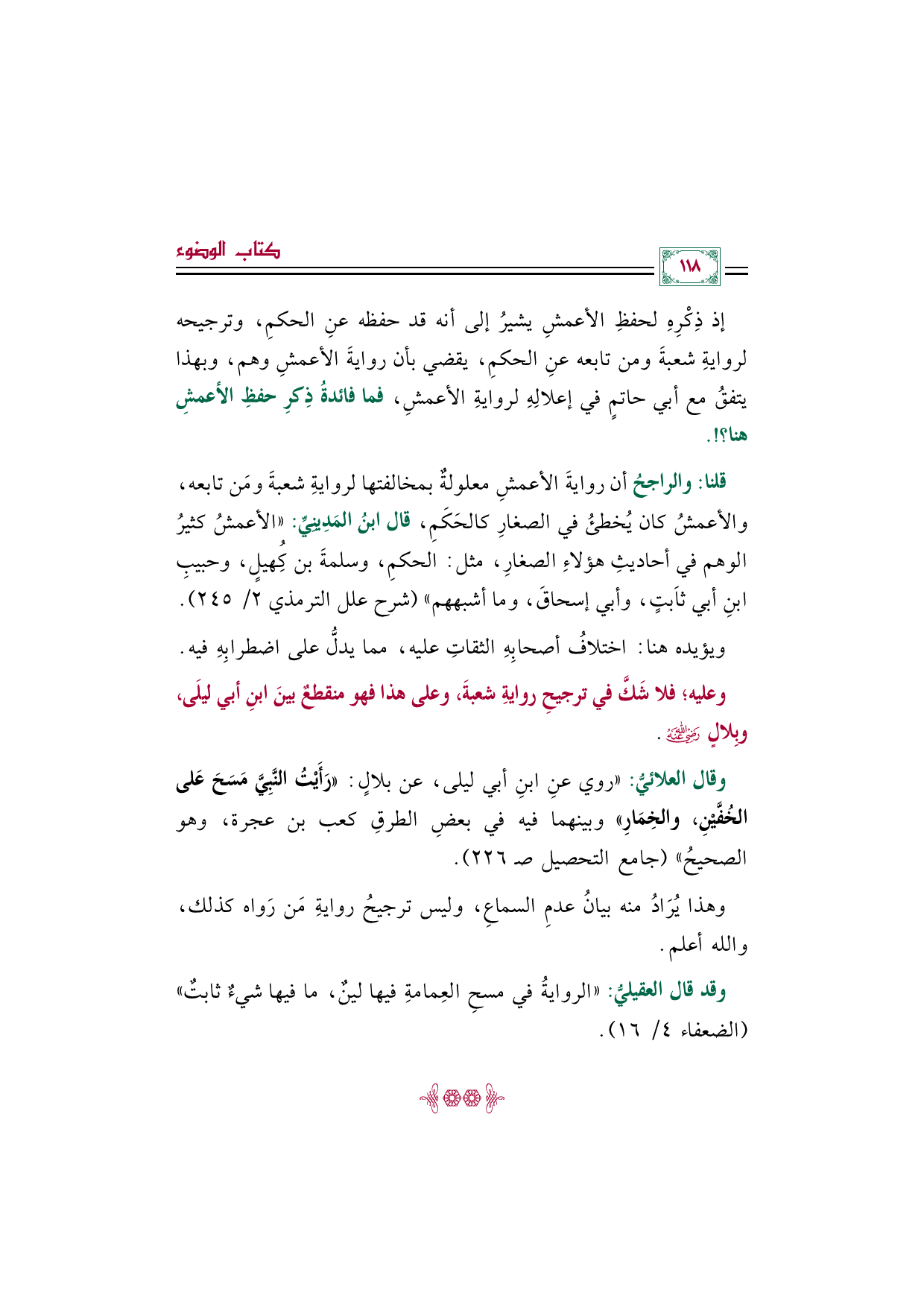 قلنا: والراجحُ أن روايةَ الأعمشِ معلولةٌ بمخالفتها لروايةِ شعبةَ ومَن تابعه، والأعمشُ كان يخطئ في الصغارِ كالحَكَمِ، قال ابنُ المَدِينِيِّ: ((الأعمشُ كثيرُ الوهم في أحاديثِ هؤلاءِ الصغارِ، مثل: الحكمِ، وسلمةَ بنِ كُهيلٍ، وحبيبِ بنِ أبي ثابتٍ، وأبي إسحاقَ، وما أشبههم)) (شرح علل الترمذي ٢/ ٢٤٥).