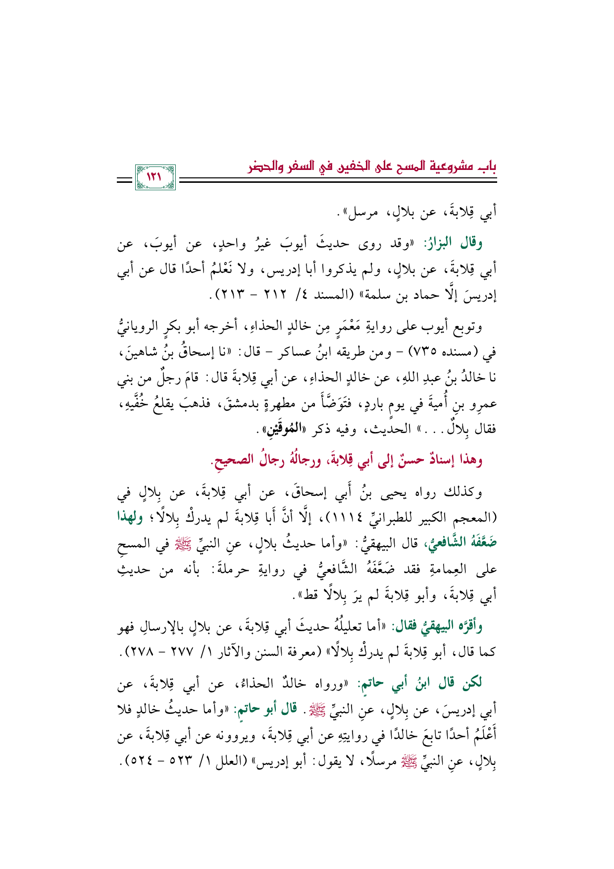لكن قال ابنُ أبي حاتمٍ: ((ورواه خالدٌ الحذاءُ، عن أبي قلابةَ، عن أبي إدريسَ، عن بلالٍ، عنِ النبيِّ صلى الله عليه وسلم. قال أبو حاتمٍ: ((وأما حديثُ خالدٍ فلا أَعلمُ أحدًا تابع خالدًا في روايته عن أبي قلابةَ، ويروونه عن أبي قلابةَ، عن بلالٍ، عنِ النبيِّ صلى الله عليه وسلم مرسلًا، لا يقول: أبو إدريس)) (العلل ١/ ٥٢٣ - ٥٢٤).