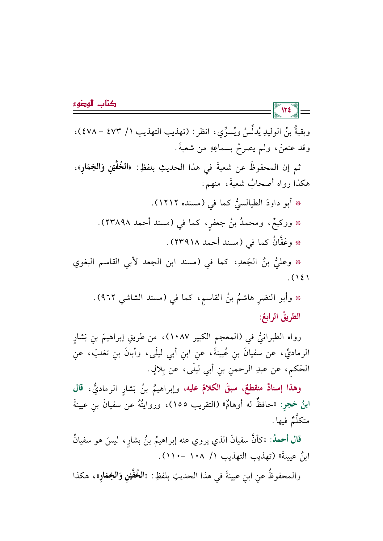 ثم إن المحفوظَ عن شعبةَ في هذا الحديثِ بلفظِ: «الخُفَّيْنِ وَالخِمَارِ»، هكذا رواه أصحابُ شعبةَ، منهم: