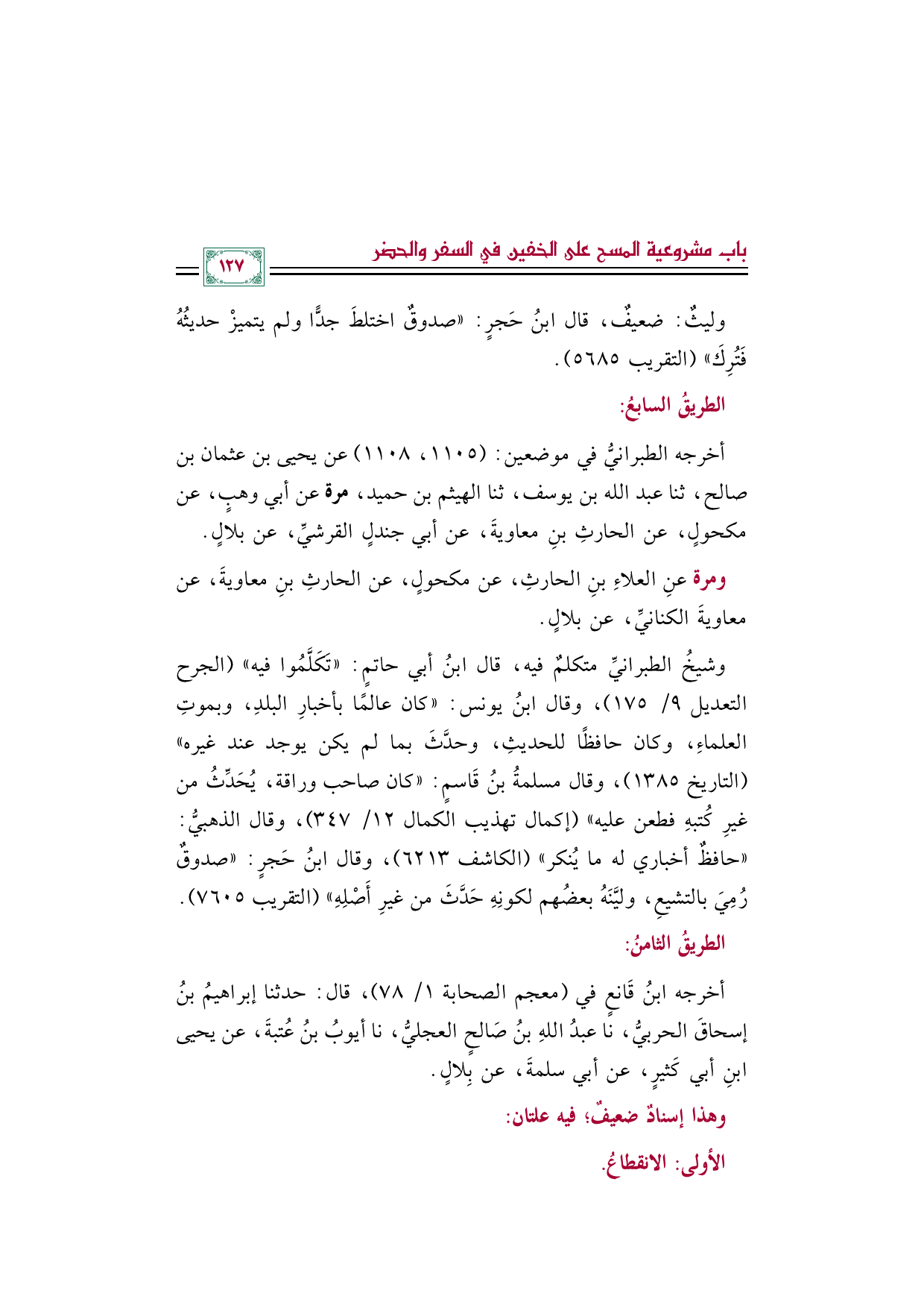 ومرة عن العلاء بن الحارث، عن مكحول، عن الحارث بن معاوية، عن معاوية الكناني، عن بلال.