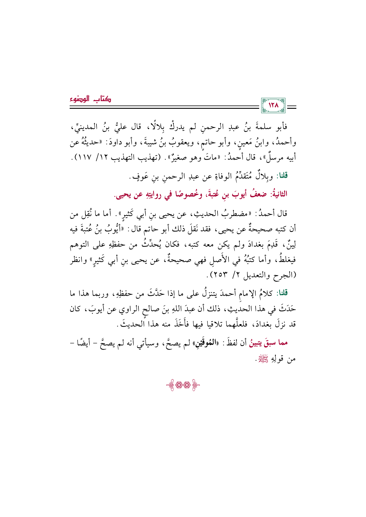 فأبو سلمة بن عبد الرحمن لم يدركْ بِلالًا، قال عليُّ بنُ المدينيِّ، وأحمدُ، وابنُ مَعينٍ، وأبو حاتمٍ، ويعقوبُ بنُ شيبةَ، وأبو داودَ: "حديثُهُ عن أبيه مرسلٌ"، قال أحمدُ: "ماتَ وهو صغيرٌ". (تهذيب التهذيب ١٢/ ١١٧).