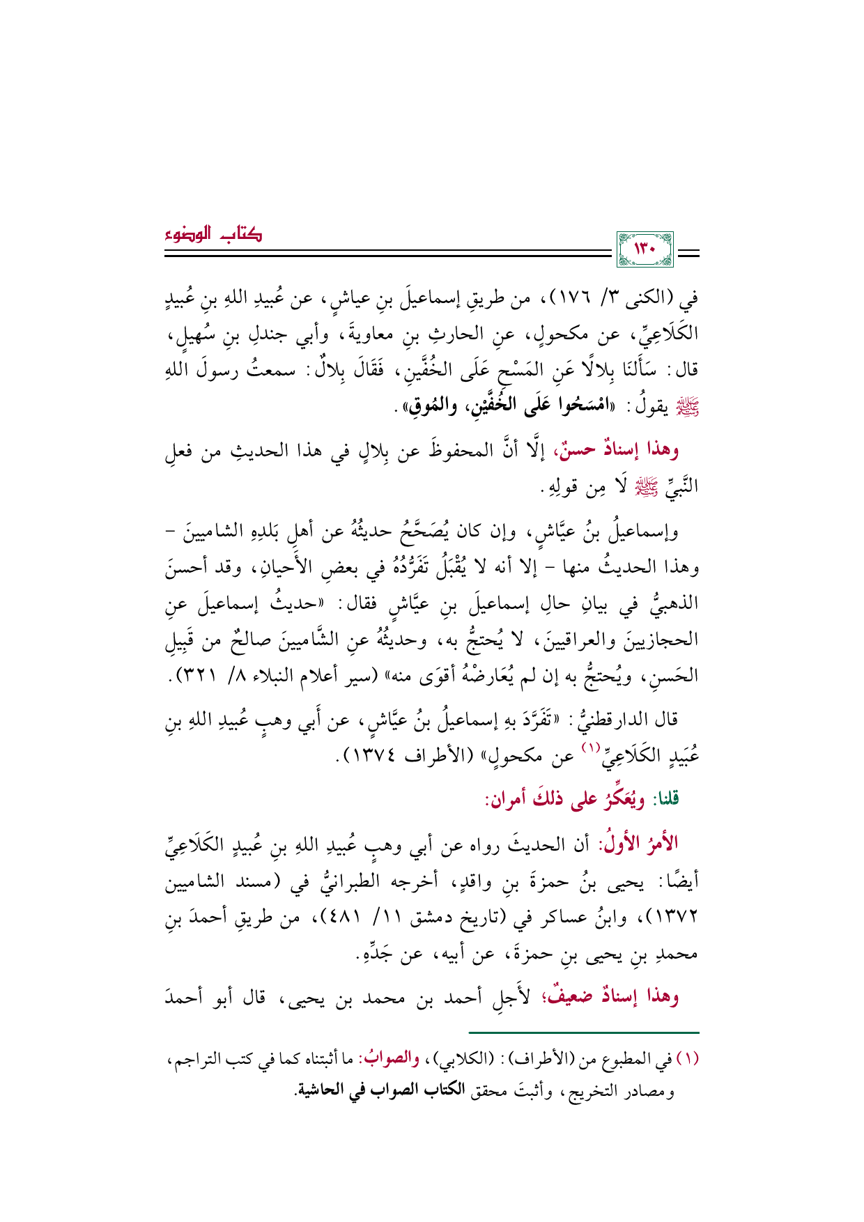 قال الدارقطنيُّ: ((تَفَرَّدَ بهِ إسماعيلُ بنُ عيَّاشٍ، عن أبي وهبٍ عُبيدِ اللهِ بنِ عُبَيدٍ الكلاعي (¬١) عن مكحولٍ)) (الأطراف ١٣٧٤).