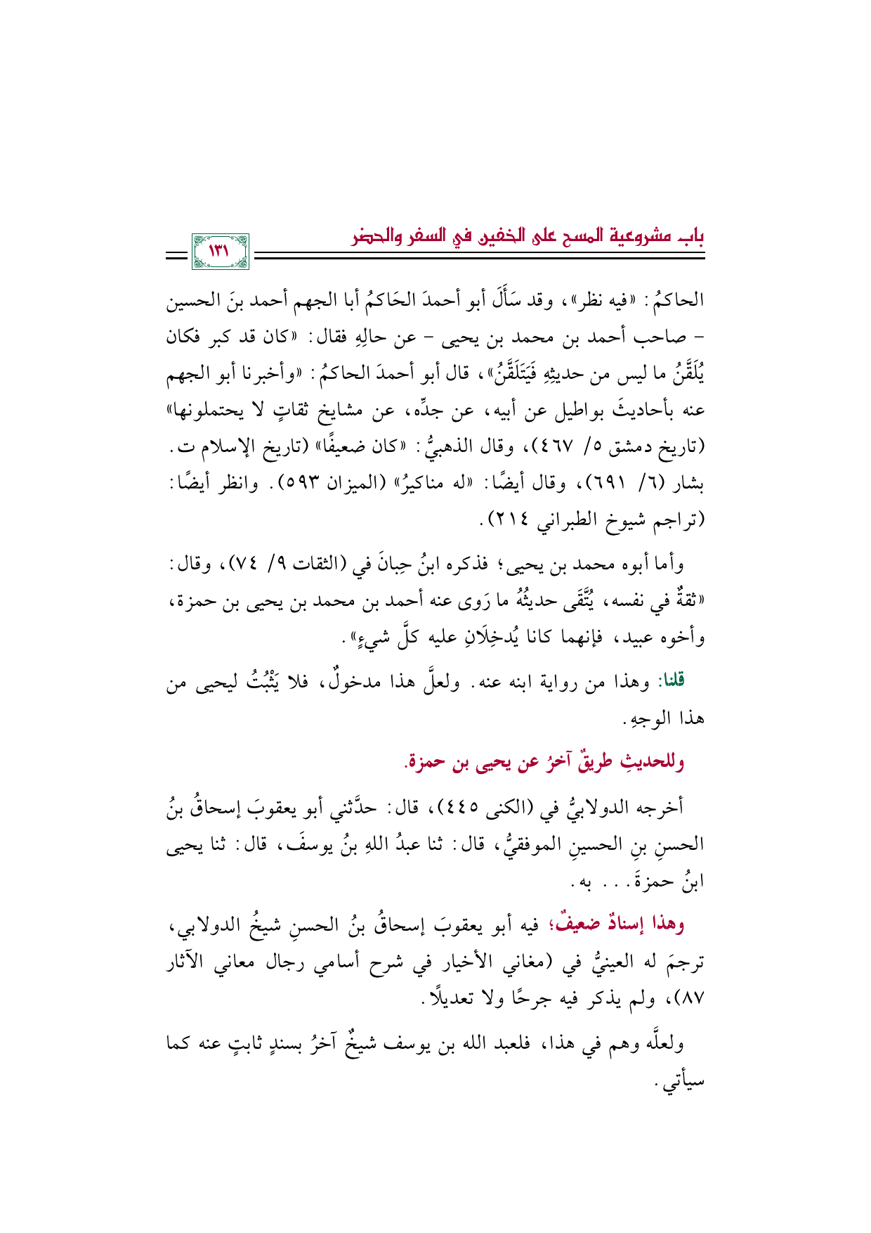أخرجه الدولابيُّ في (الكنى ٤٤٥)، قال: حدثني أبو يعقوب إسحاقُ بنُ الحسنِ بنِ الحسينِ الموفقيُّ، قال: ثنا عبدُ اللهِ بنُ يوسفَ، قال: ثنا يحيى بنُ حمزةَ ... به.