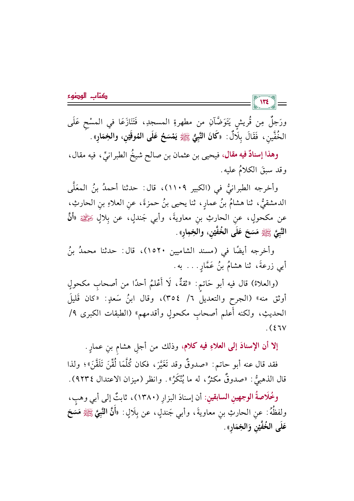 وأخرجه الطبرانيُّ في (الكبير ١١٠٩)، قال: حدثنا أحمد بن المعلى الدمشقيُّ، ثنا هشامُ بنُ عمارٍ، ثنا يحيى بنُ حمزةَ، عن العلاء بن الحارث، عن مكحول، عن الحارث بن معاوية، وأبي جندل، عن بلال رضي الله عنه ((أنَّ النَّبِيَّ صلى الله عليه وسلم مَسَحَ عَلَى الخُفَّيْنِ، والخِمِارِ)).