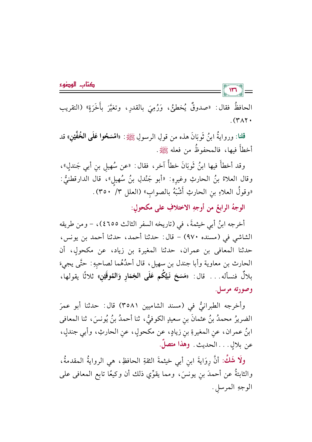 وقد أخطأَ فيها ابنُ ثَوبَانَ خطأً آخر، فقال: "عن سهيلِ بنِ أبي جَندلٍ"، وقال العلاءُ بنُ الحارثِ وغيرِهِ: "أبو جَنْدلِ بنُ سُهيلٍ"، قال الدارقطنيُّ: "وقولُ العلاءِ بنِ الحارثِ أَشْبَهُ بالصوابِ" (العلل ٣/ ٣٥٠).