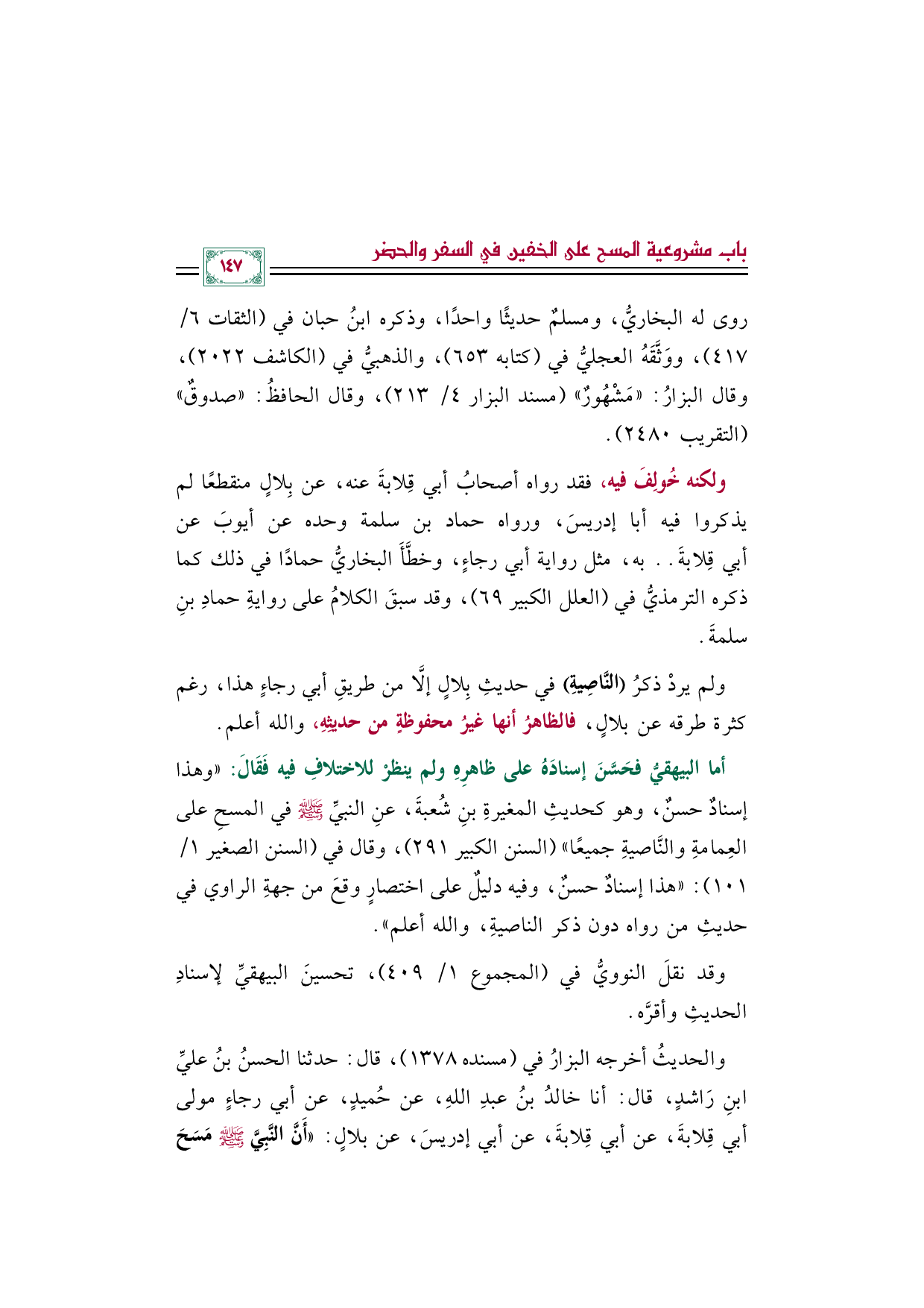 ولم يردْ ذكرُ (النَّاصِيةِ) في حديثِ بِلالٍ إلَّا من طريقِ أبي رجاء هذا، رغم كثرة طرقه عن بلالٍ، فالظاهرُ أنها غيرُ محفوظةٍ من حديثِهِ، والله أعلم.