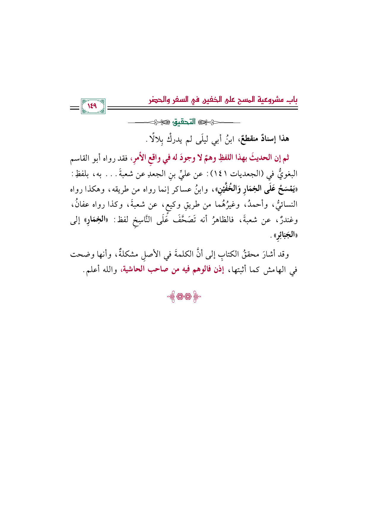 ثم إن الحديثَ بهذا اللفظِ وهمٌ لا وجودَ له في واقعِ الأمرِ، فقد رواه أبو القاسم البغويُّ في (الجعديات ١٤١): عن عليِّ بنِ الجعدِ عن شعبةَ ... به، بلفظِ: ((يَمْسَحُ عَلَى الخِمَارِ وَالخُفَّيْنِ))، وابنُ عساكر إنما رواه من طريقه، وهكذا رواه النسائيُّ، وأحمدُ، وغيرُهُما من طريقِ وكيعٍ، عن شعبةَ، وكذا رواه عفانُ، وغندرٌ، عن شعبةَ، فالظاهرُ أنه تَصَحَّفَ عَلَى النَّاسِخِ لفظ: "الخِمَارِ" إلى "الجَبَائِرِ".