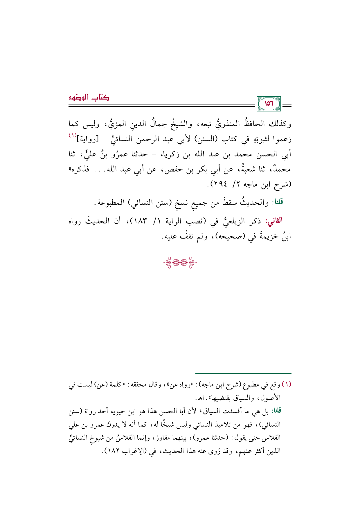 (¬١) وقع في مطبوع (شرح ابن ماجه): "رواه عن"، وقال محققه: "كلمة (عن) ليست في الأصول، والسياق يقتضيها"اهـ. قلنا: بل هي ما أفسدت السياق؛ لأن أبا الحسن هذا هو ابن حيويه أحد رواة (سنن النسائي)، فهو من تلاميذ النسائي وليس شيخًا له، كما أنه لا يدرك عمرو بن علي الفلاس حتى يقول: (حدثنا عمرو)، بينهما مفاوز، وإنما الفلاسُ من شيوخِ النسائيِّ الذين أكثر عنهم، وقد رَوى عنه هذا الحديث، في (الإغراب ١٨٢).