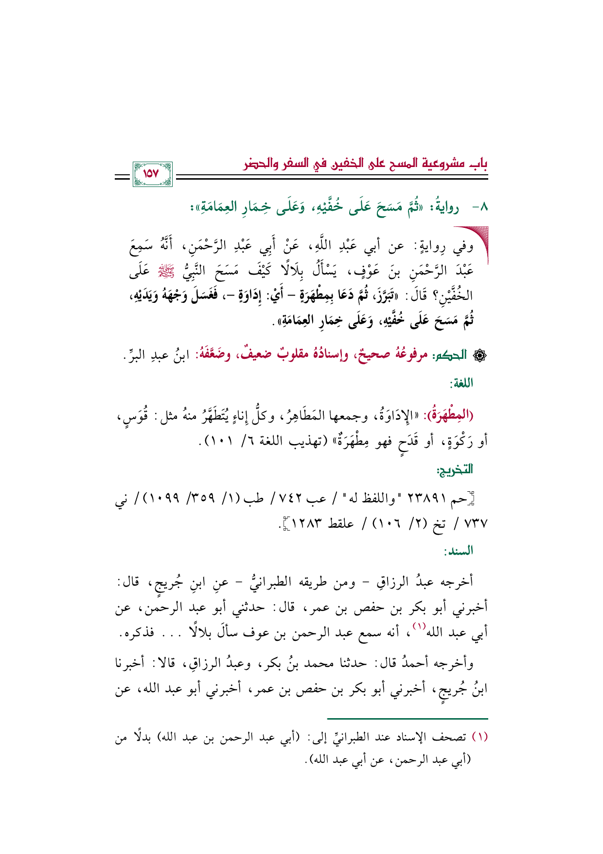 أخرجه عبد الرزاق -ومن طريقه الطبرانيِّ- عنِ ابنِ جُريجٍ، قال: أخبرني أبو بكر بن حفص بن عمر، قال: حدثني أبو عبد الرحمن، عن أبي عبد الله (¬١)، أنه سمع عبد الرحمن بن عوف سألَ بلالًا ... فذكره.