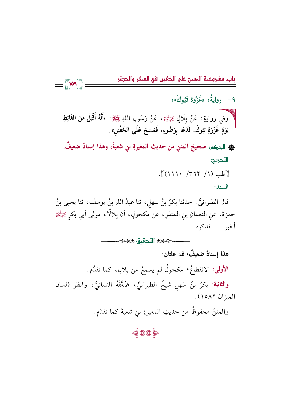 • وفي روايةٍ: عَنْ بِلَالٍ رضي الله عنه، عَنْ رَسُولِ اللهِ صلى الله عليه وسلم: ((أَنَّهُ أَقْبَلَ مِنَ الغَائِطِ يَوْمَ غَزْوَةِ تَبُوكَ، فَدَعَا بِوَضُوءٍ، فَمَسَحَ عَلَى الخُفَّيْنِ)).