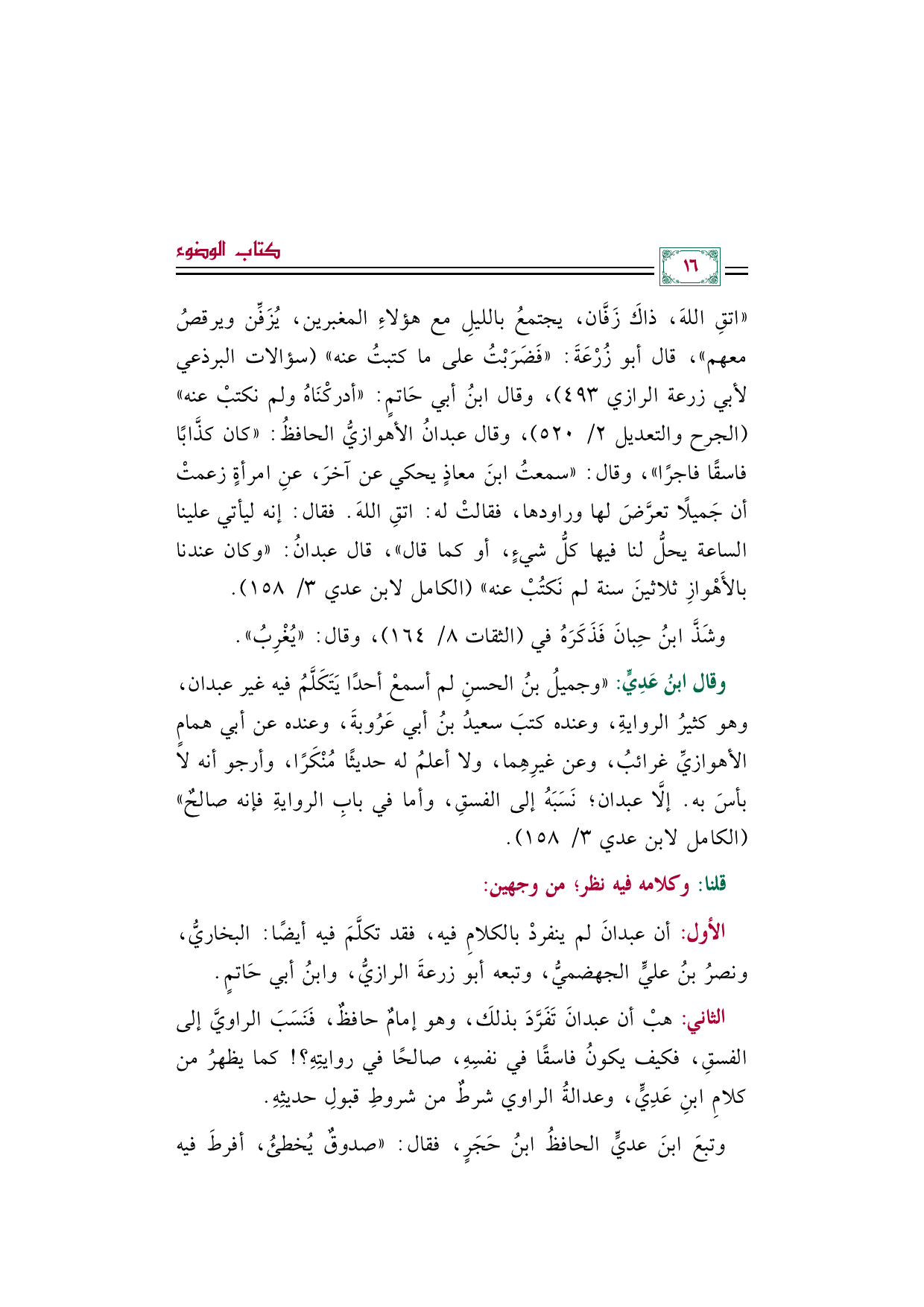 الثاني: هبْ أن عبدانَ تَفَرَّدَ بذلكَ، وهو إمامٌ حافظٌ، فَنَسَبَ الراويَّ إلى الفسقِ، فكيف يكونُ فاسقًا في نفسِهِ، صالحًا في روايتِهِ؟ ! كما يظهرُ من كلامِ ابنِ عَدِيٍّ، وعدالةُ الراوي شرطٌ من شروطِ قبولِ حديثِهِ.