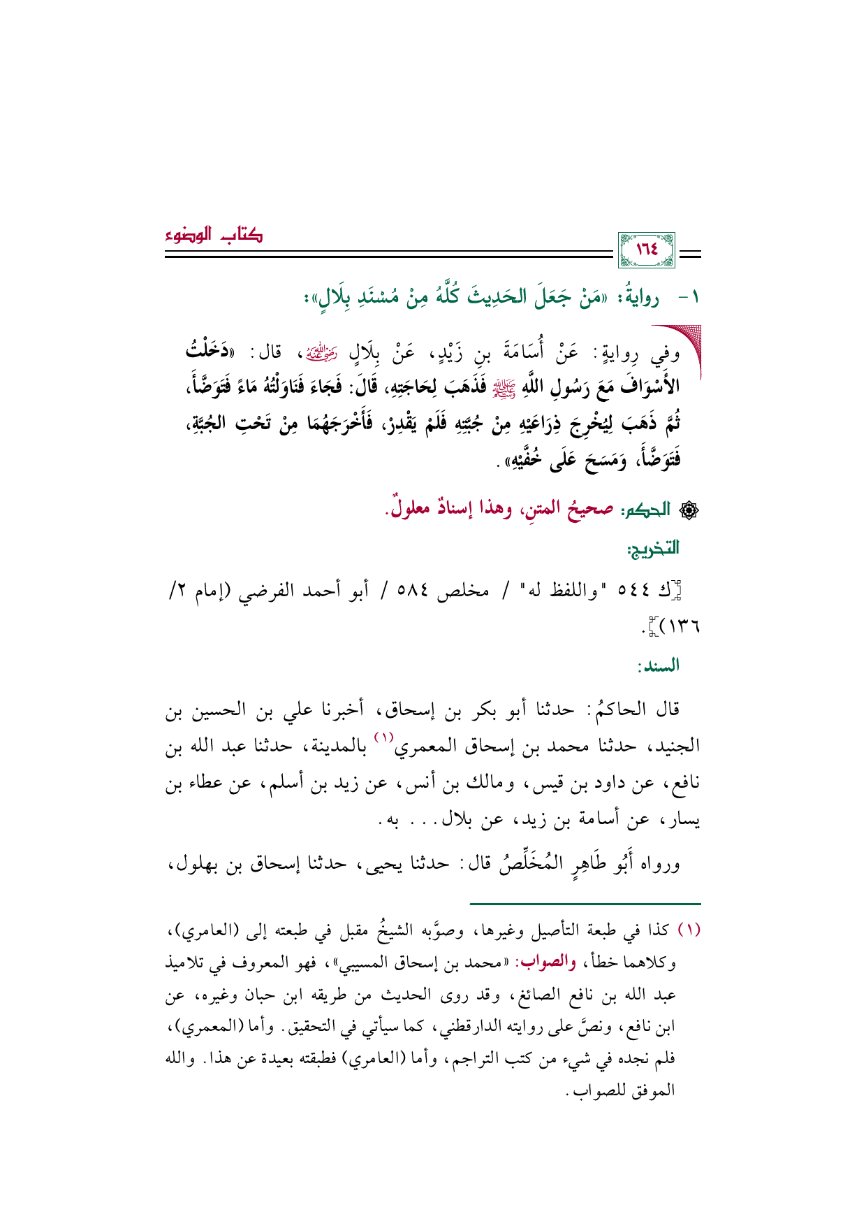 قال الحاكمُ: حدثنا أبو بكر بن إسحاق، أخبرنا علي بن الحسين بن الجنيد، حدثنا محمد بن إسحاق المعمري (¬١) بالمدينة، حدثنا عبد الله بن نافع، عن داود بن قيس، ومالك بن أنس، عن زيد بن أسلم، عن عطاء بن يسار، عن أسامة بن زيد، عن بلال ... به.