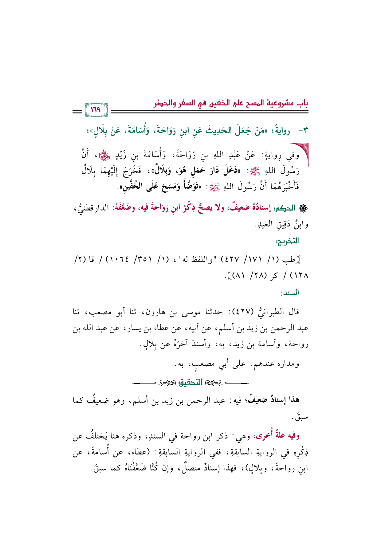 قال الطبرانيُّ (٤٢٧): حدثنا موسى بن هارون، ثنا أبو مصعب، ثنا عبد الرحمن بن زيد بن أسلم، عن أبيه، عن عطاء بن يسار، عن عبد الله بن رواحة، وأسامة بن زيد، به، وأسندَ آخره عن بِلالٍ.