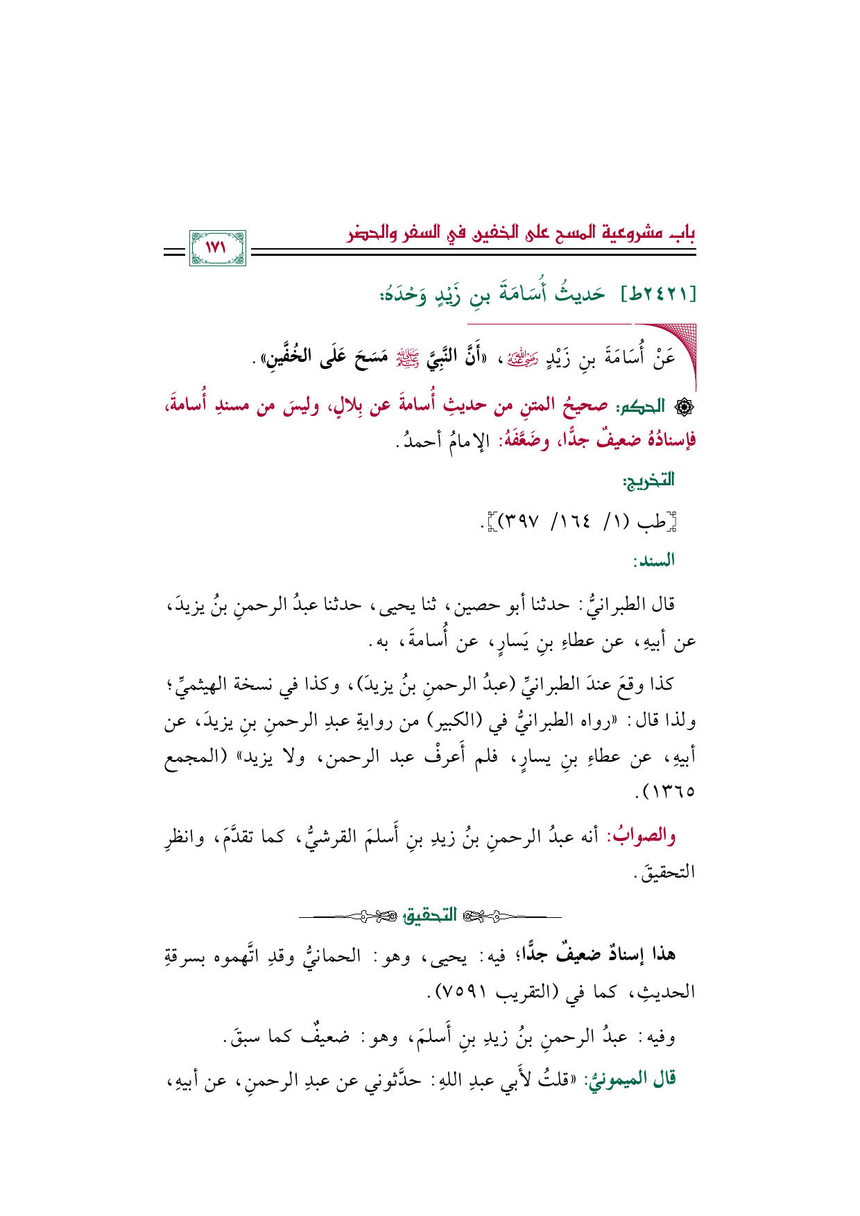 قال الطبرانيُّ: حدثنا أبو حصين، ثنا يحيى، حدثنا عبدُ الرحمنِ بنُ يزيدَ، عن أبيهِ، عن عطاءِ بنِ يسارٍ، عن أُسامةَ، به.