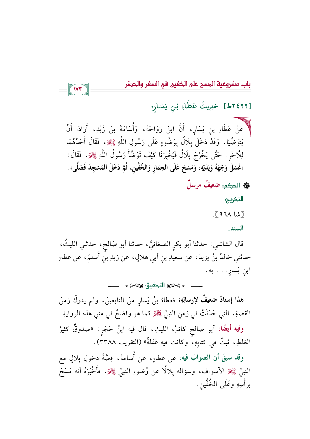 ◼ عَنْ عَطَاءِ بْنِ يَسَارٍ، أَنَّ ابْنَ رَوَاحَةَ، وَأُسَامَةَ بْنَ زَيْدٍ، أَرَادَا أَنْ يَتَوَضَّيَا، وَقَدْ دَخَلَ بِلَالٌ بِوَضُوءٍ عَلَى رَسُولِ اللَّهِ صلى الله عليه وسلم، فَقَالَ أَحَدُهُمَا لِلْآخَرِ: حَتَّى يَخْرُجَ بِلَالٌ فَيُخْبِرَنَا كَيْفَ تَوَضَّأَ رَسُولُ اللَّهِ صلى الله عليه وسلم، فَقَالَ: ((غَسَلَ وَجْهَهُ وَيَدَيْهِ، وَمَسَحَ عَلَى الخِمَارِ وَالخُفَّينِ، ثُمَّ دَخَلَ المَسْجِدَ فَصَلَّى)).