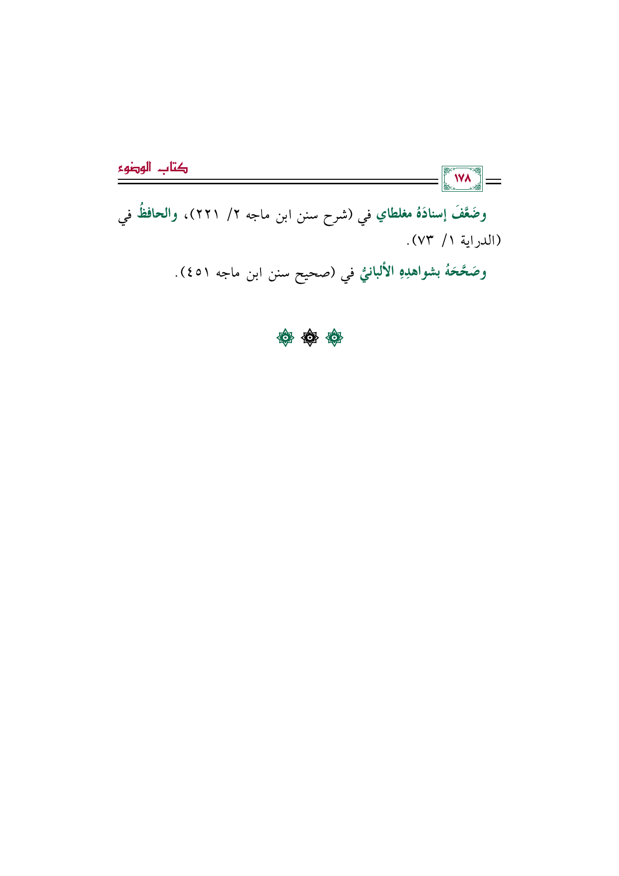 وضَعَّفَ إسنادَهُ مغلطاي في (شرح سنن ابن ماجه ٢/ ٢٢١)، والحافظُ في (الدراية ١/ ٧٣).