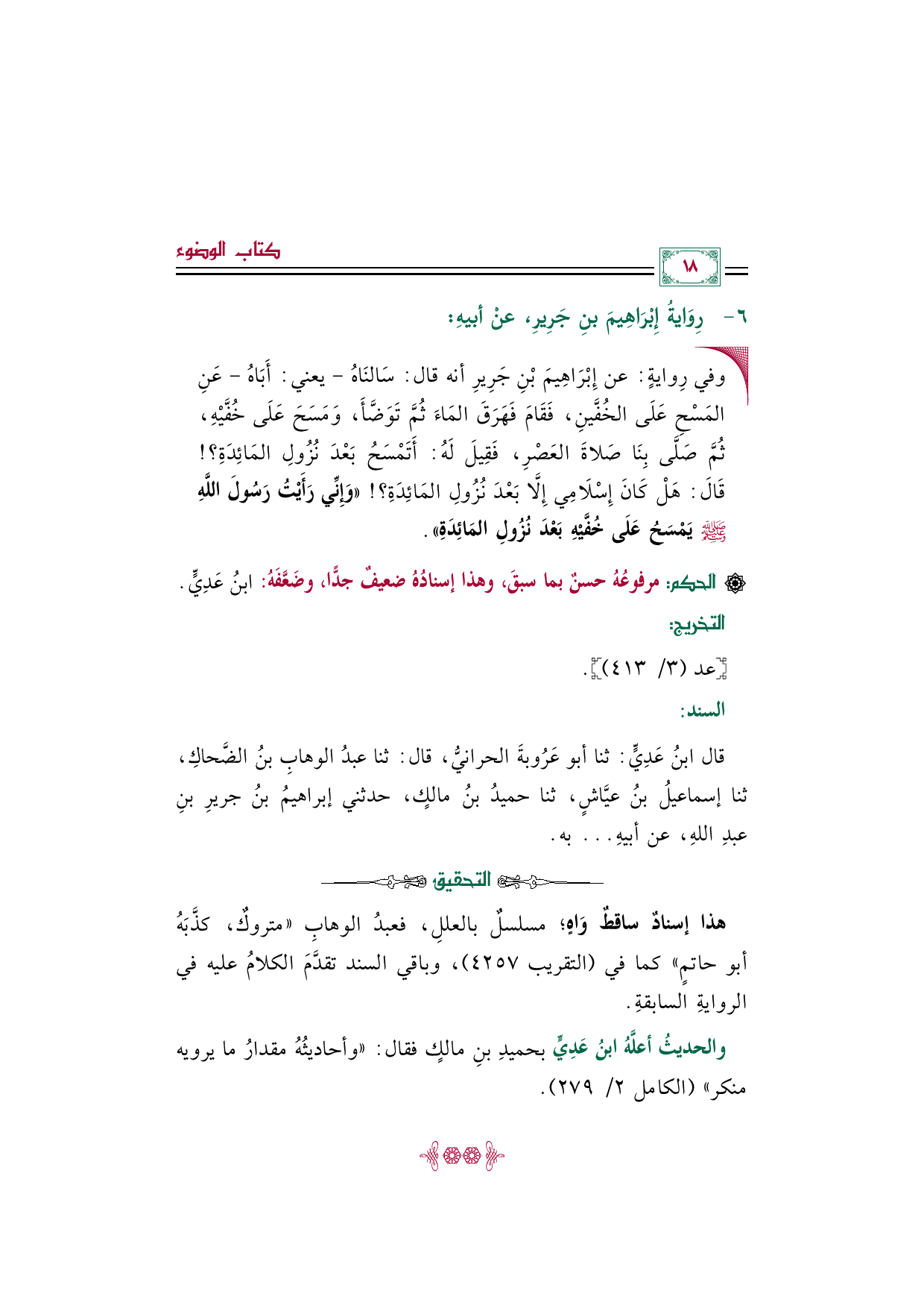 قال ابنُ عَدِيٍّ: ثنا أبو عَرُوبةَ الحرانيُّ، قال: ثنا عبدُ الوهابِ بنُ الضَّحاكِ، ثنا إسماعيلُ بنُ عيَّاشٍ، ثنا حميدُ بنُ مالكٍ، حدثني إبراهيمُ بنُ جريرِ بنِ عبدِ اللهِ، عن أبيهِ ... به.