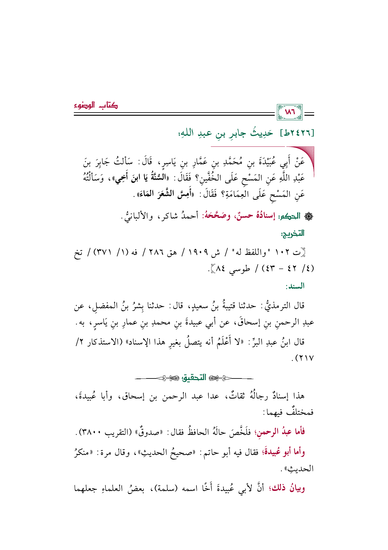 قال الترمذيُّ: حدثنا قتيبةُ بنُ سعيدٍ، قال: حدثنا بِشرُ بنُ المفضلِ، عن عبدِ الرحمنِ بنِ إسحاقَ، عن أبي عبيدةَ بنِ محمدِ بنِ عمارِ بنِ يَاسرٍ، به.