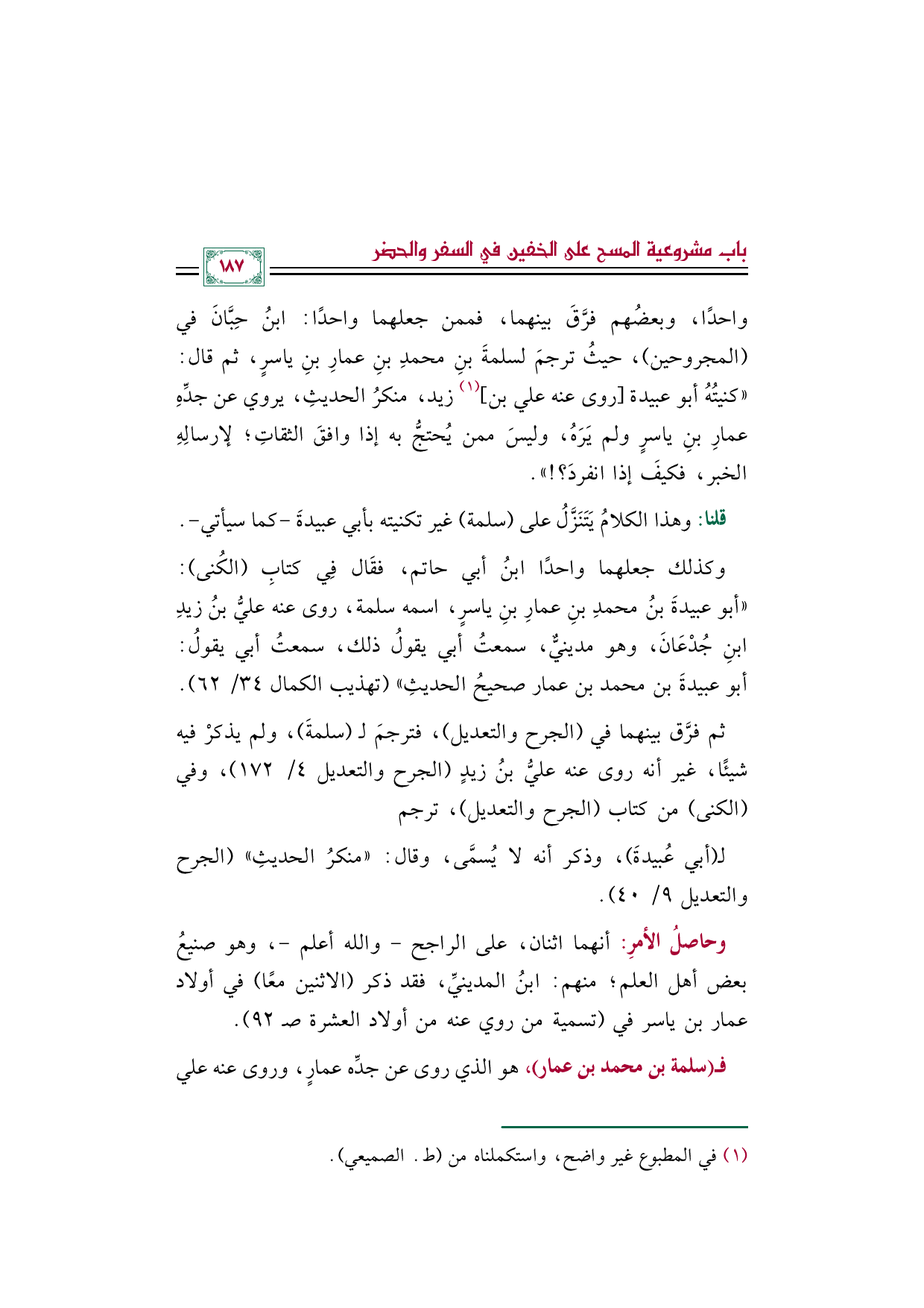 وكذلك جعلهما واحدًا ابن أبي حاتم، فقَال فِي كتاب (الكنى): "أبو عبيدةَ بنُ محمدِ بنِ عمارِ بنِ ياسرٍ، اسمه سلمة، روى عنه عليُّ بنُ زيدِ بنِ جُدْعَانَ، وهو مدينيٌّ، سمعتُ أبي يقولُ ذلك، سمعتُ أبي يقولُ: أبو عبيدةَ بن محمد بن عمار صحيحُ الحديثِ" (تهذيب الكمال ٣٤/ ٦٢).