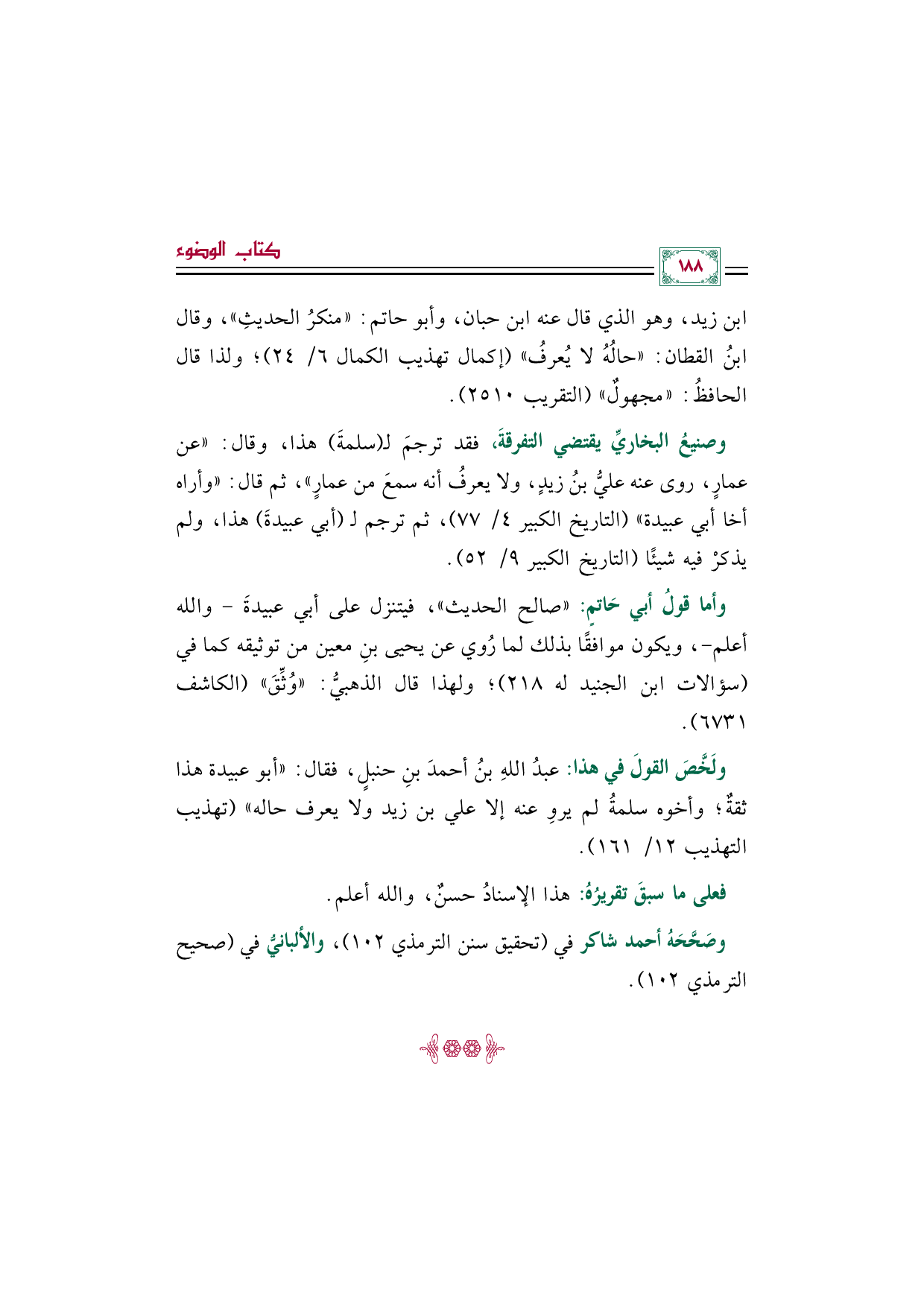 ولخَّصَ القولَ في هذا، عبدُ اللهِ بنُ أحمدَ بنِ حنبلٍ، فقال: "أبو عبيدة هذا ثقةٌ؛ وأخوه سلمة لم يروِ عنه إلا علي بن زيد ولا يعرف حاله" (تهذيب التهذيب ١٢/ ١٦١).