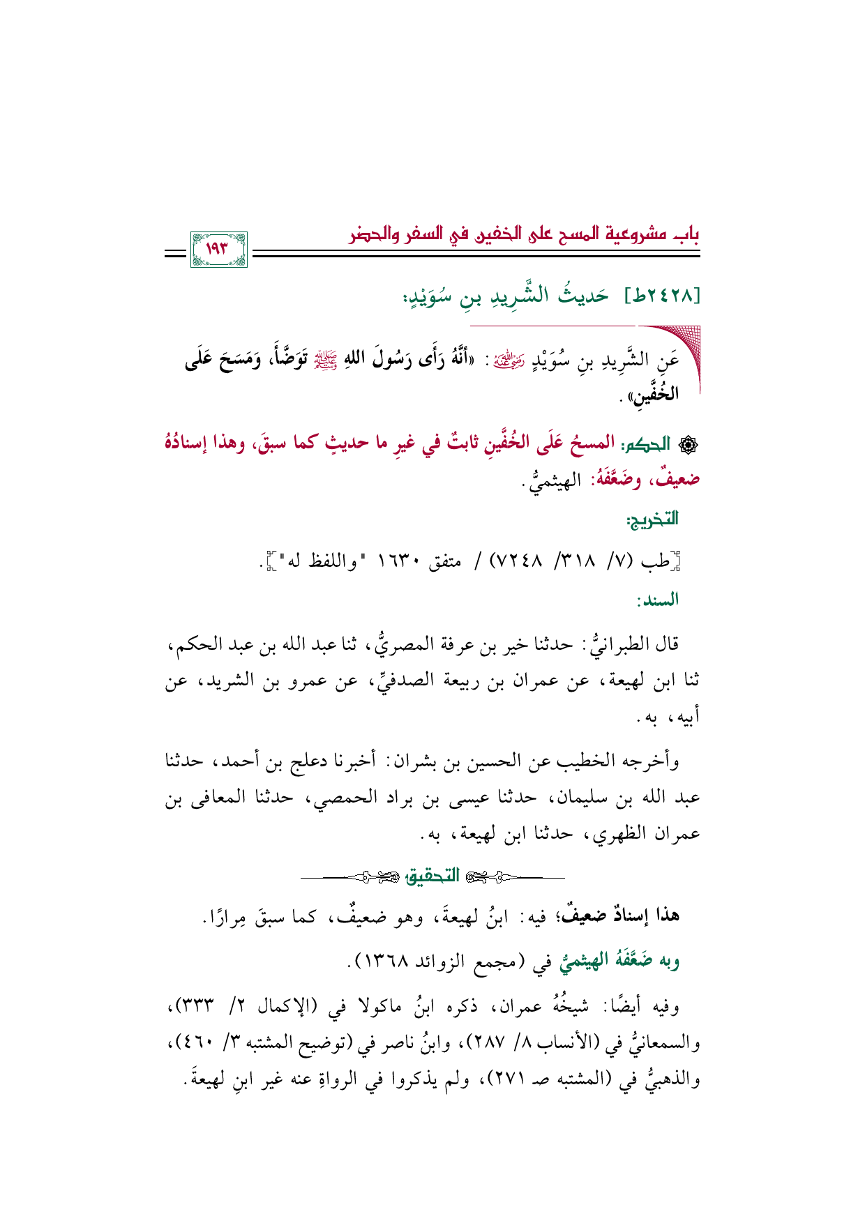 قال الطبرانيُّ: حدثنا خير بن عرفة المصريُّ، ثنا عبد الله بن عبد الحكم، ثنا ابن لهيعة، عن عمران بن ربيعة الصدفيِّ، عن عمرو بن الشريد، عن أبيه، به.