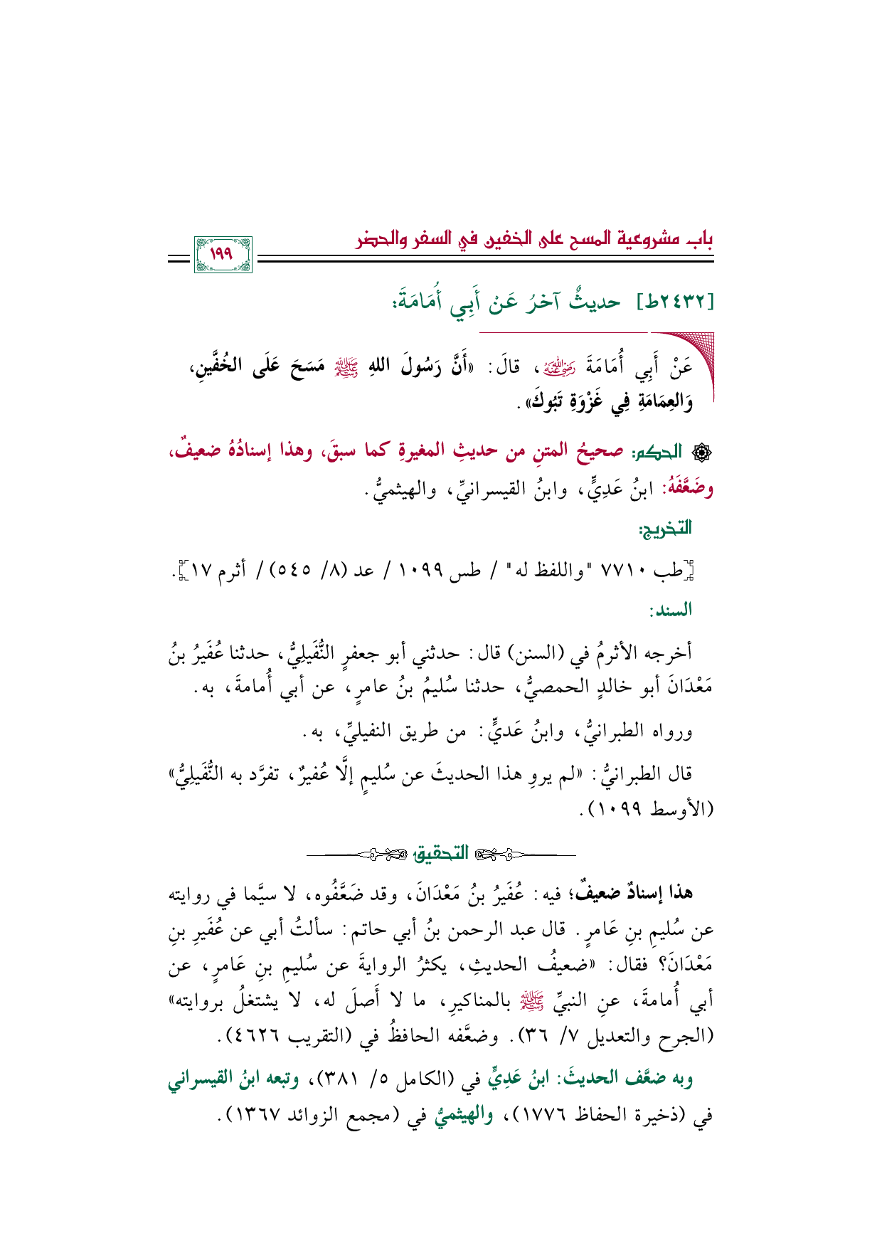 هذا إسنادٌ ضعيفٌ؛ فيه: عُفَيرُ بنُ مَعْدَانَ، وقد ضعَّفوه، لا سيَّما في روايته عن سُليمِ بنِ عَامرٍ. قال عبد الرحمن بن أبي حاتم: سألتُ أبي عن عُفَيرِ بنِ مَعْدَانَ؟ فقال: ((ضعيفُ الحديثِ، يكثرُ الروايةَ عن سُليمِ بنِ عَامرٍ، عن أبي أُمامةَ، عنِ النبيِّ صلى الله عليه وسلم بالمناكيرِ، ما لا أصلَ له، لا يشتغلُ بروايته)) (الجرح والتعديل ٧/ ٣٦). وضعَّفه الحافظُ في (التقريب ٤٦٢٦).