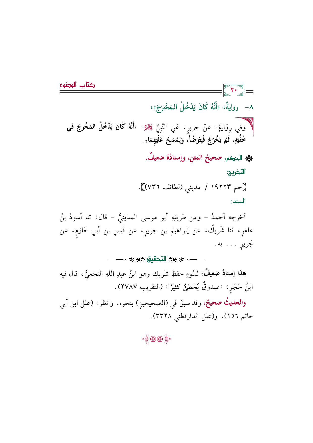 • وفي رِوَايةٍ: عنْ جريرٍ، عَنِ النَّبِيِّ صلى الله عليه وسلم: ((أَنَّهُ كَانَ يَدْخُلُ المَخْرَجَ فِي خُفَّيْهِ، ثُمَّ يَخْرُجُ فَيَتَوَضَّأُ، وَيَمْسَحُ عَلَيْهِمَا)).