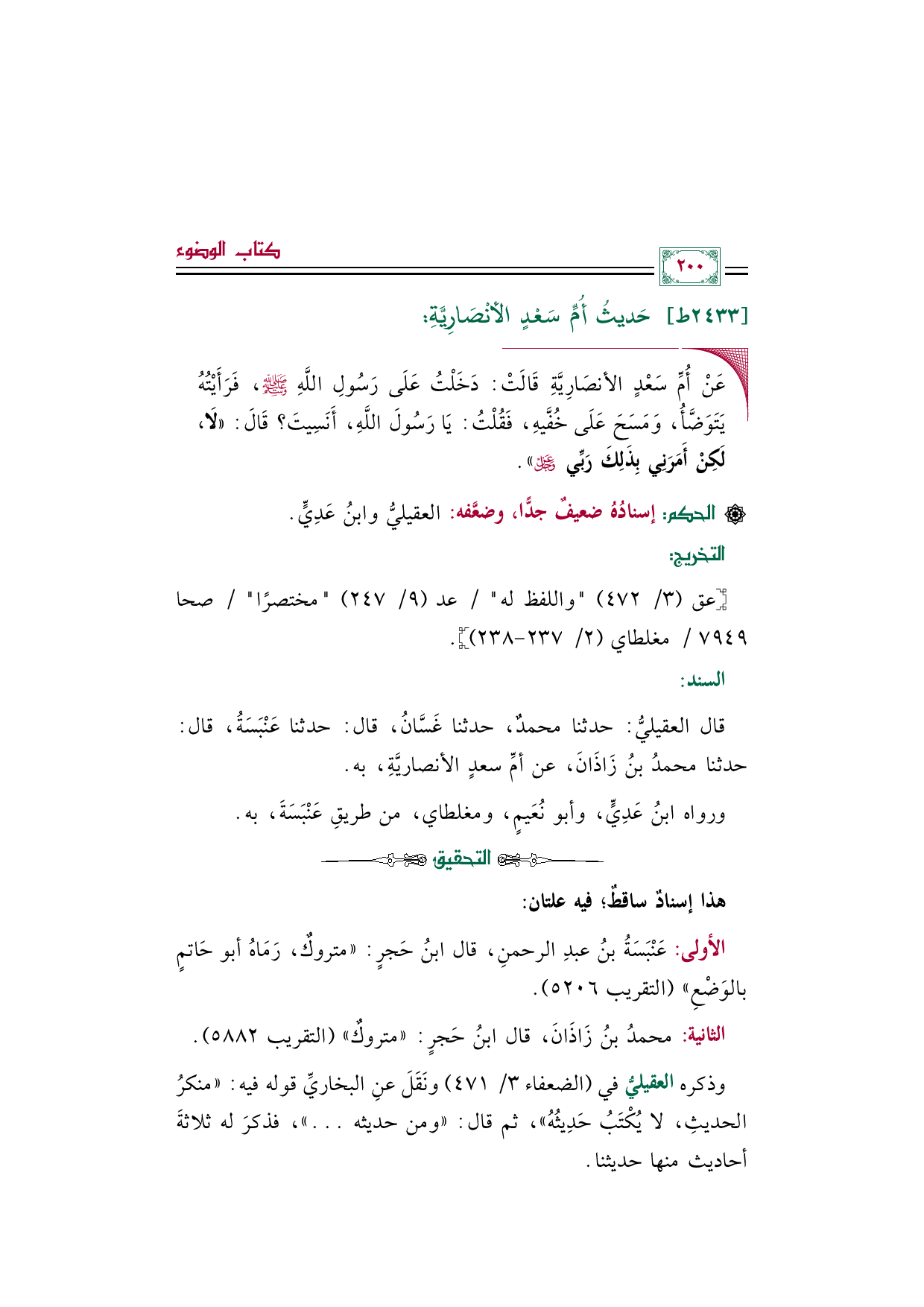 قال العقيليُّ: حدثنا محمدٌ، حدثنا غَسَّانُ، قال: حدثنا عَنْبَسَةُ، قال: حدثنا محمدُ بنُ زَاذَانَ، عن أمِّ سعدٍ الأنصاريَّةِ، به.