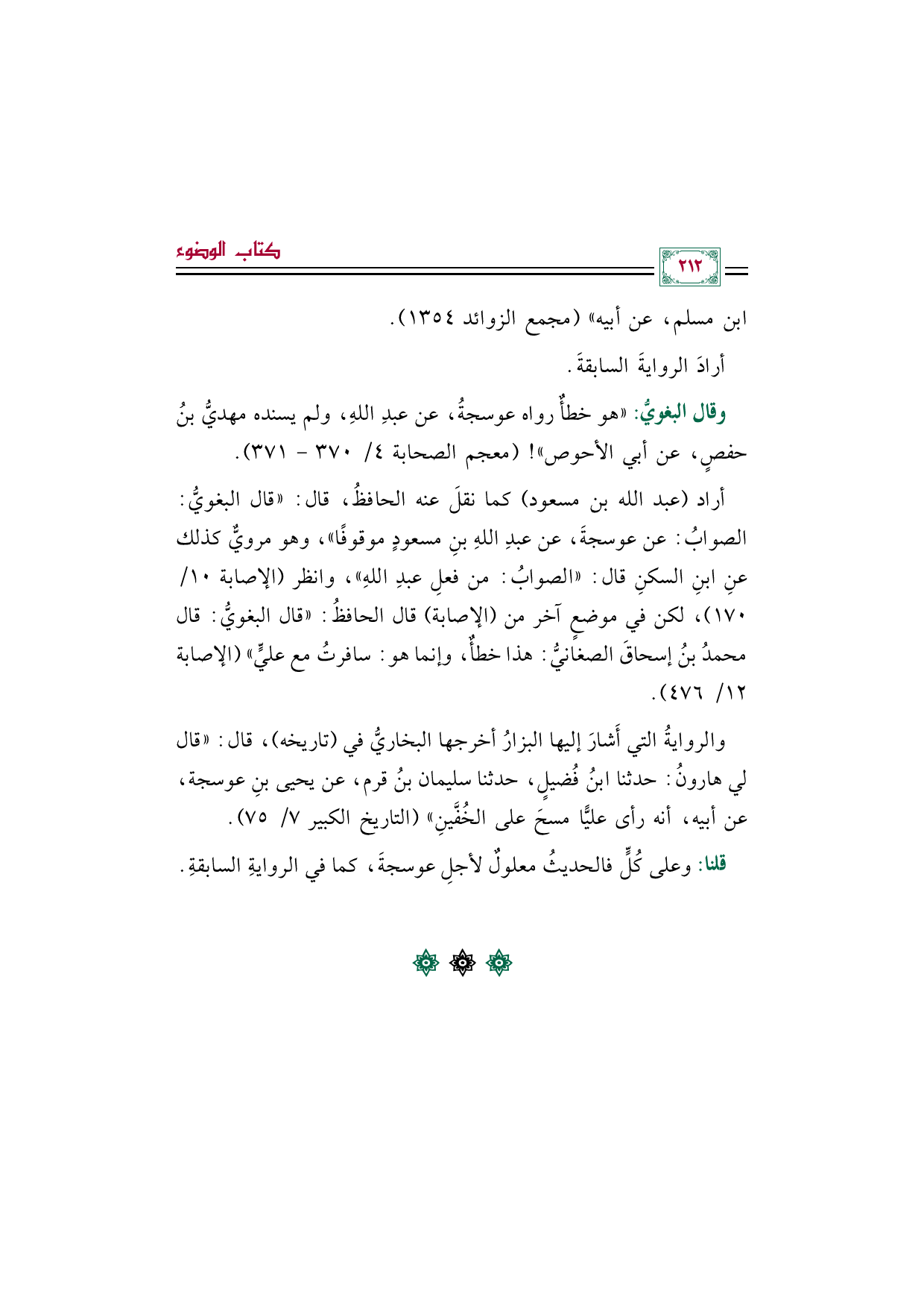 وقال البغويُّ: "هو خطأٌ رواه عوسجةُ، عن عبدِ اللهِ، ولم يسنده مهديُّ بنُ حفصٍ، عن أبي الأحوص"! (معجم الصحابة ٤/ ٣٧٠ - ٣٧١).