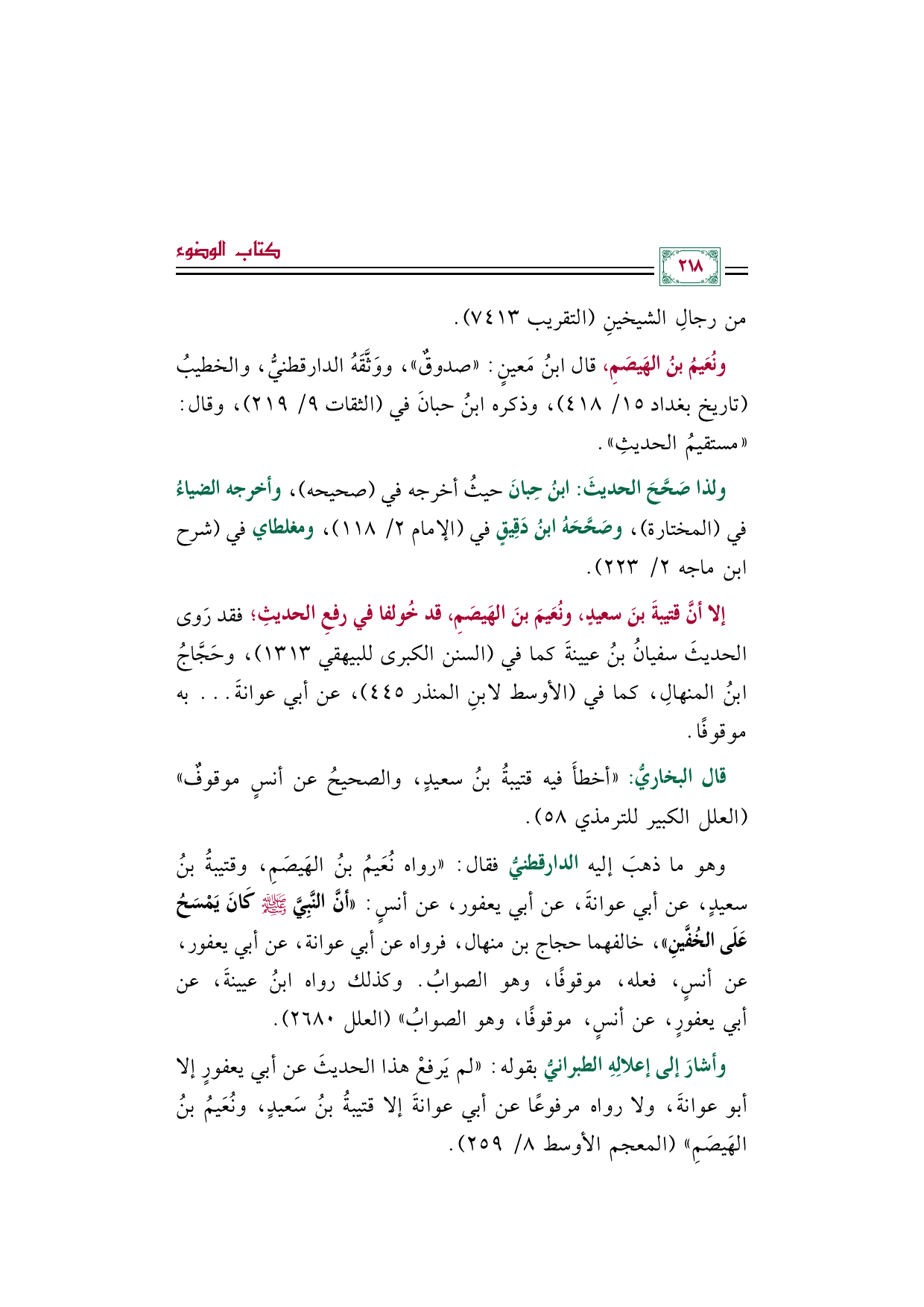ونُعَيمُ بنُ الهَيصَمِ، قال ابنُ مَعينٍ: "صدوقٌ"، ووَثَّقَهُ الدارقطنيُّ، والخطيبُ (تاريخ بغداد ١٥/ ٤١٨)، وذكره ابنُ حبانَ في (الثقات ٩/ ٢١٩)، وقال: "مستقيمُ الحديثِ".