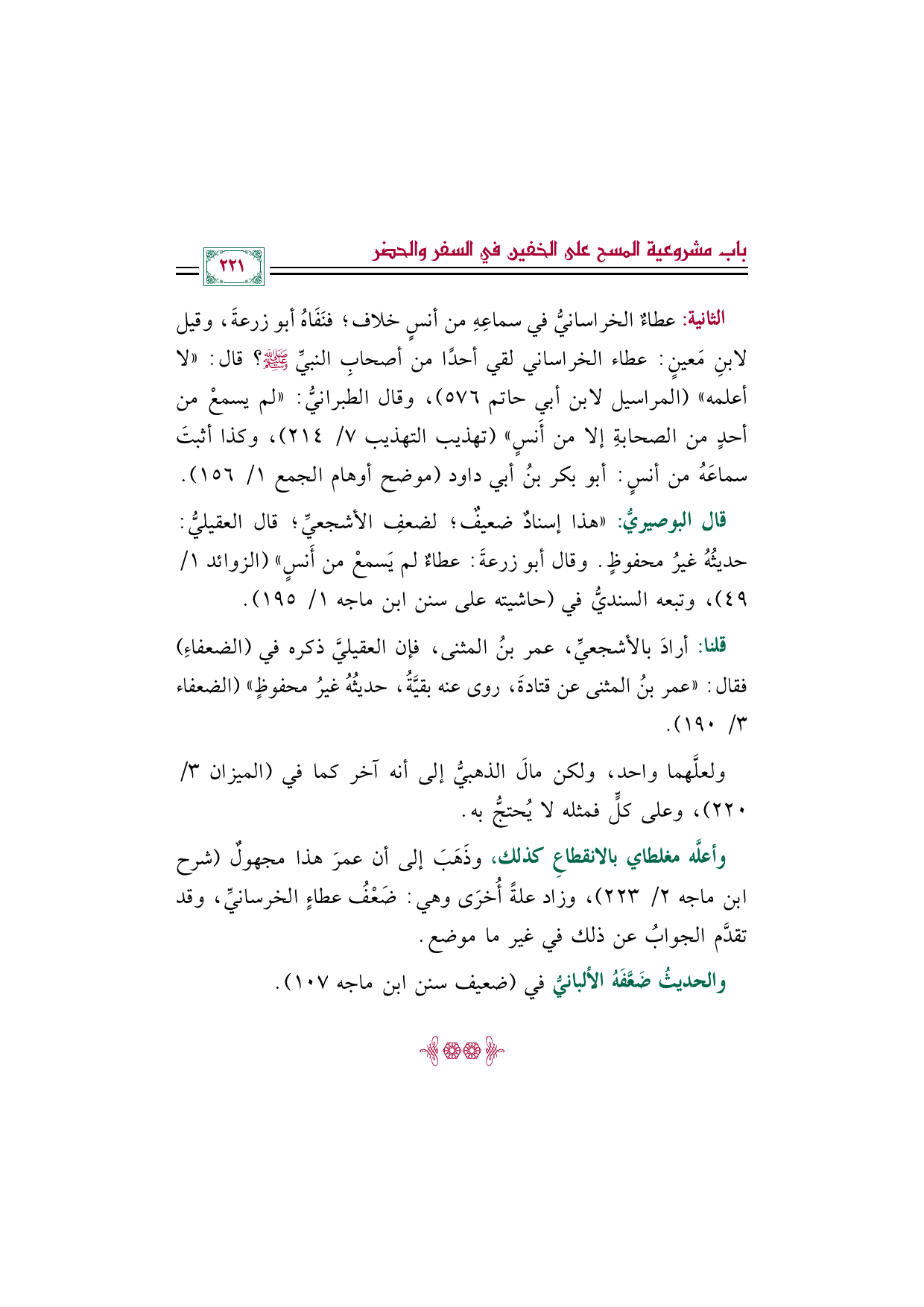 وأعلَّه مغلطاي بالانقطاعِ كذلك، وذَهَبَ إلى أن عمرَ هذا مجهولٌ (شرح ابن ماجه ٢/ ٢٢٣)، وزاد علةً أُخرَى وهي ضَعْفُ عطاءِ الخرسانيِّ، وقد تقدَّم الجوابُ عن ذلك في غير ما موضع.