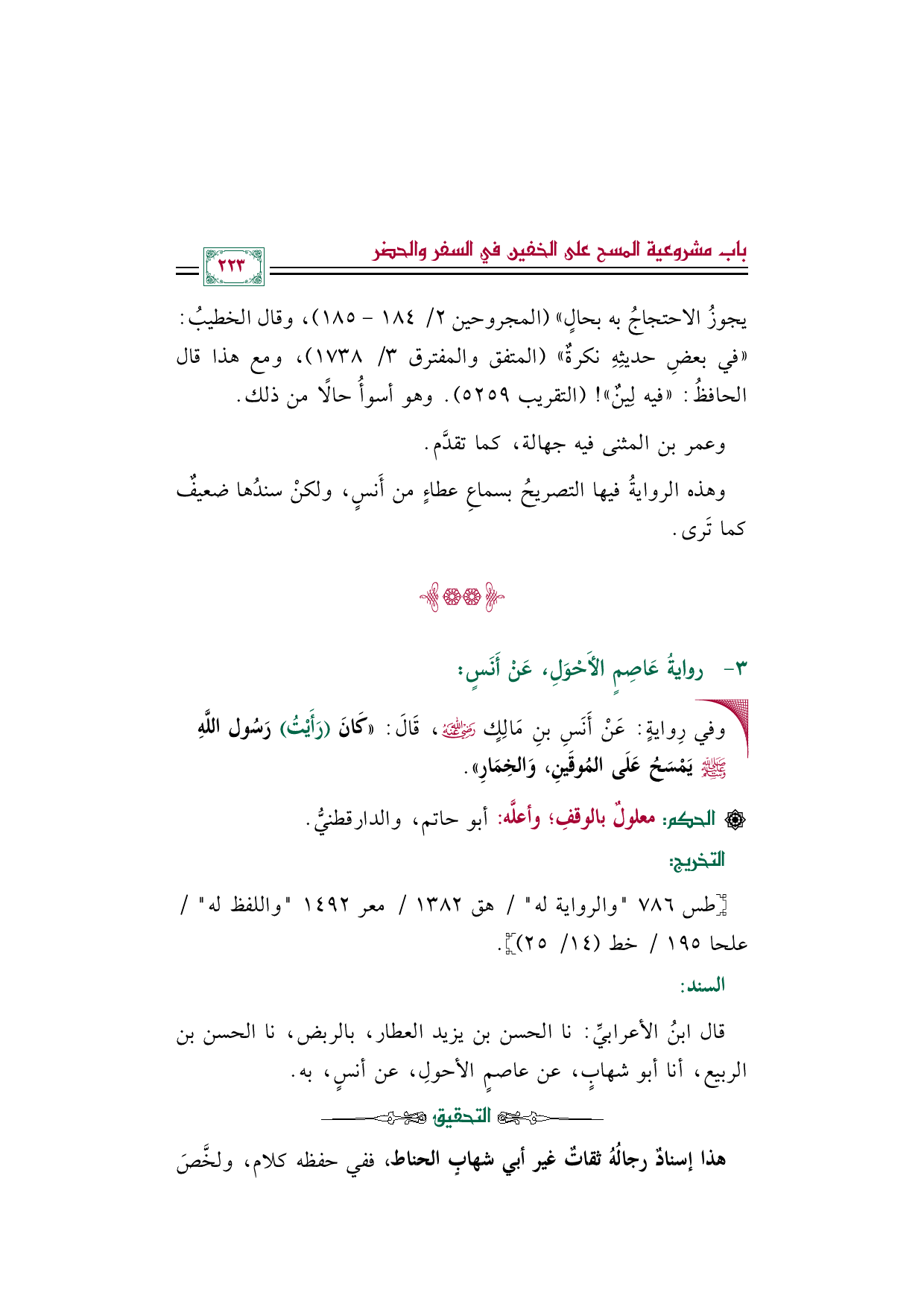 •وفي رِوايةٍ: عَنْ أَنَسِ بْنِ مَالِكٍ رضي الله عنه، قَالَ: ((كَانَ (رَأَيْتُ) رَسُول اللَّهِ صلى الله عليه وسلم يَمْسَحُ عَلَى المُوقَينِ، وَالخِمَارِ)).