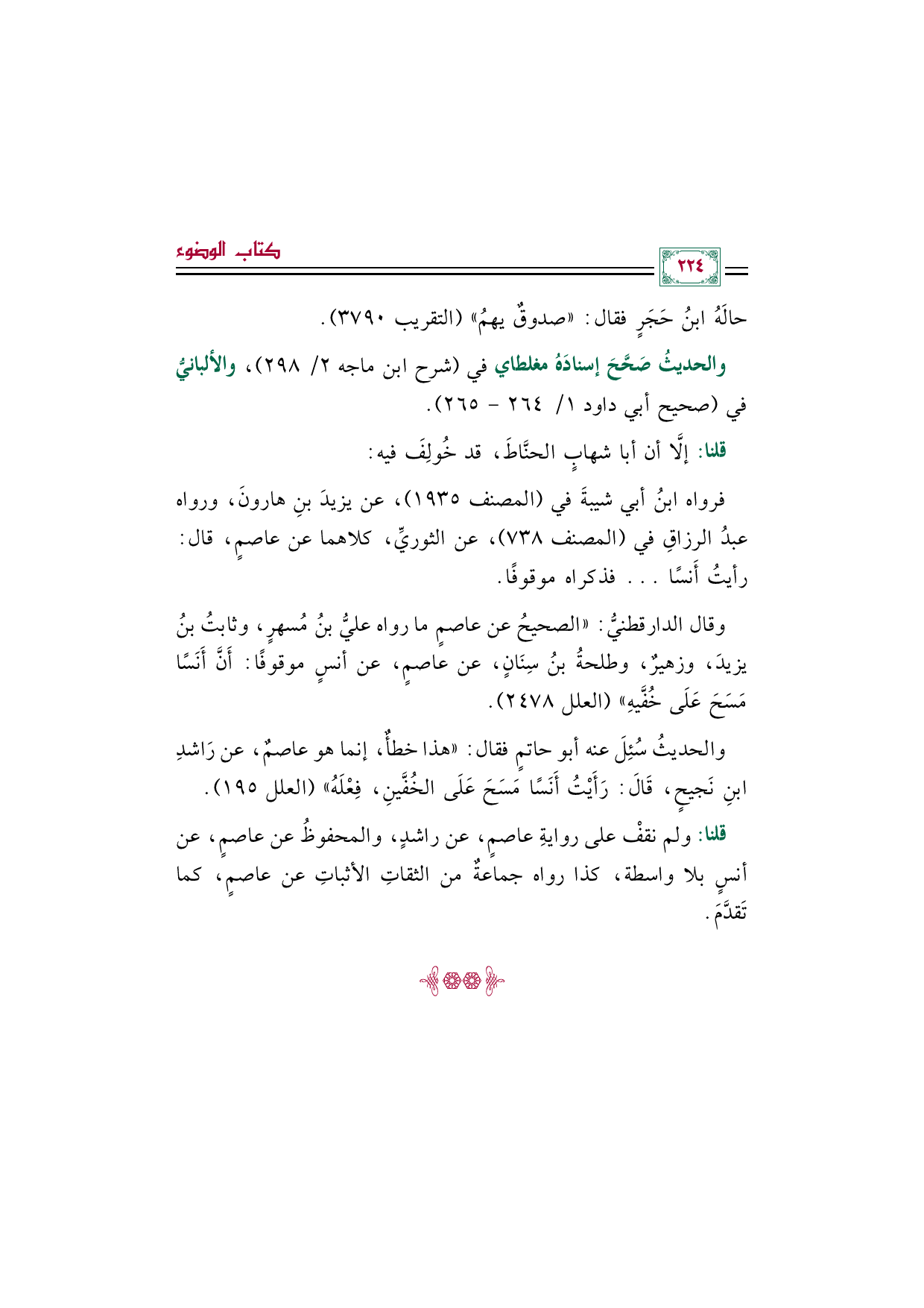 وقال الدارقطنيُّ: "الصحيحُ عن عاصمٍ ما رواه عليُّ بنُ مُسهرٍ، وثابتُ بنُ يزيدَ، وزهيرٌ، وطلحةُ بنُ سِنَانٍ، عن عاصمٍ، عن أنسٍ موقوفًا: أَنَّ أَنَسًا مَسَحَ عَلَى خُفَّيهِ" (العلل ٢٤٧٨).