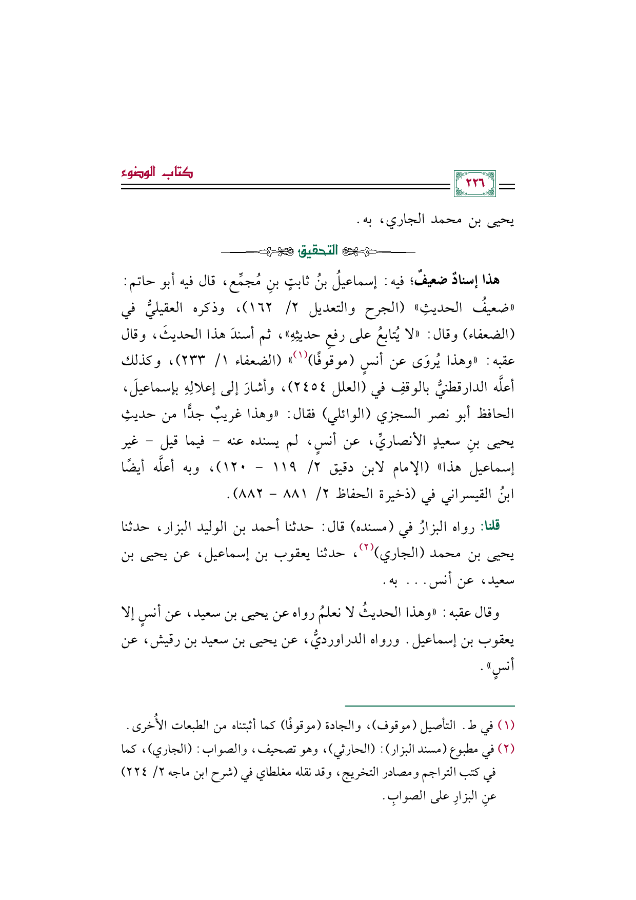 (¬٢) في مطبوع (مسند البزار): (الحارثي)، وهو تصحيف، والصواب: (الجاري)، كما في كتب التراجم ومصادر التخريج، وقد نقله مغلطاي في (شرح ابن ماجه ٢/ ٢٢٤) عنِ البزارِ على الصوابِ.