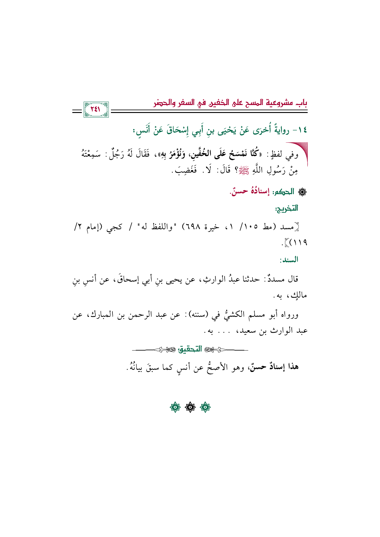 • وفي لفظٍ: ((كُنَّا نَمْسَحُ عَلَى الخُفَّينِ، وَنُؤْمَرُ بِهِ))، فَقَالَ لَهُ رَجُلٌ: سَمِعْتَهُ مِنْ رَسُولِ اللَّهِ صلى الله عليه وسلم؟ قَالَ: لَا. فَغَضِبَ.